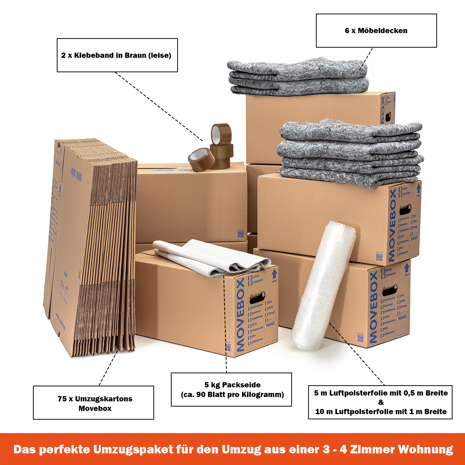 Unser komplettes Umzugspaket ist für einen komfortablen Umzug aus einer 3 bis 4 Zimmer Wohnung konzipiert und bietet Ihnen das gesamte notwendige Umzugszubehör für einen reibungslosen Umzug und das zu einem sehr günstigen Preis im Vergleich zum Einzelkauf.