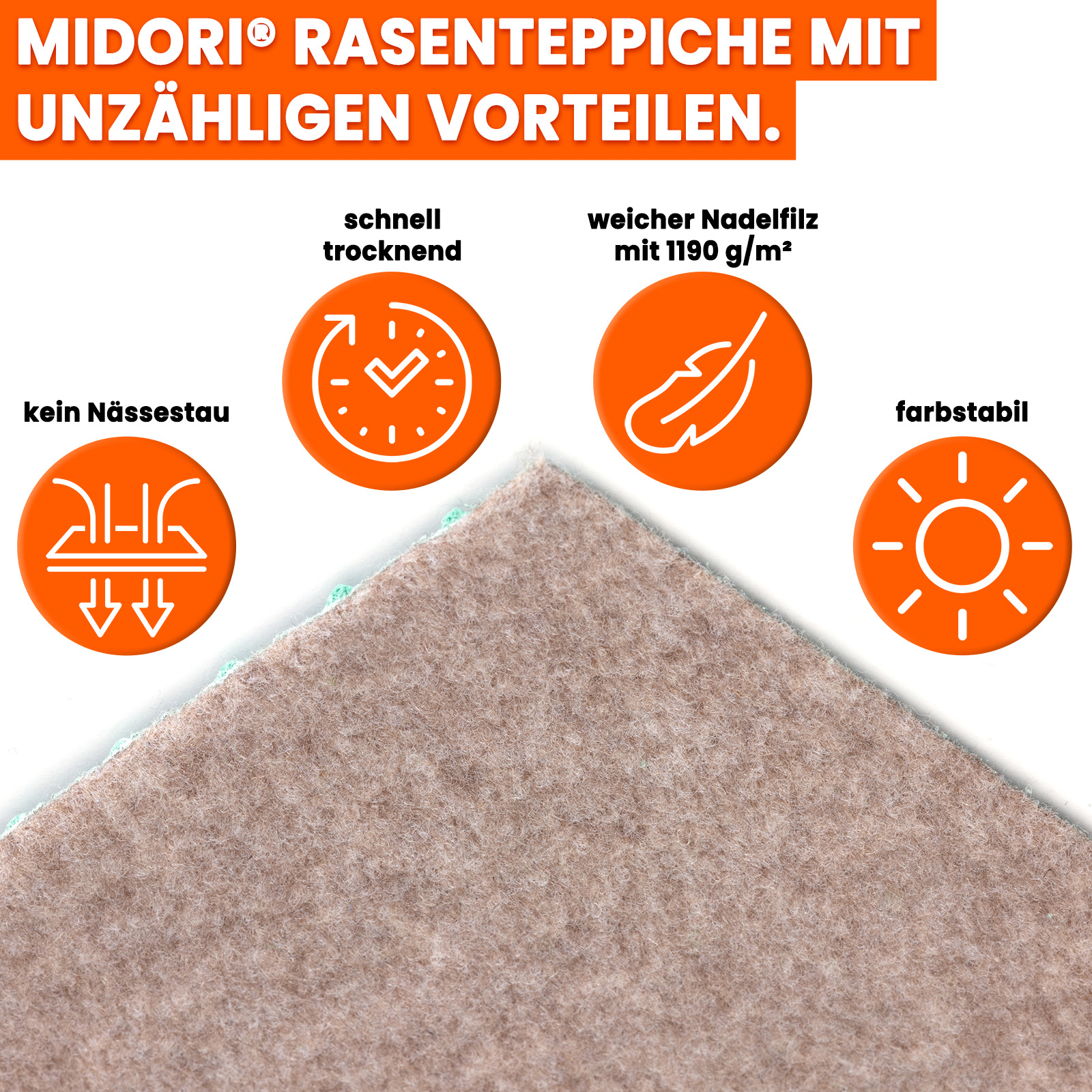 Unser hochwertiger Rasenteppich, auch bekannt als Balkonteppich oder Kunstrasen, bietet Ihnen eine erstklassige Alternative zu herkömmlichen Bodenbelägen im Außenbereich. Der MIDORI Rasenteppich besticht nicht nur durch seine Robustheit und Farbstabilität, sondern auch durch seine Vielseitigkeit in der Anwendung.
