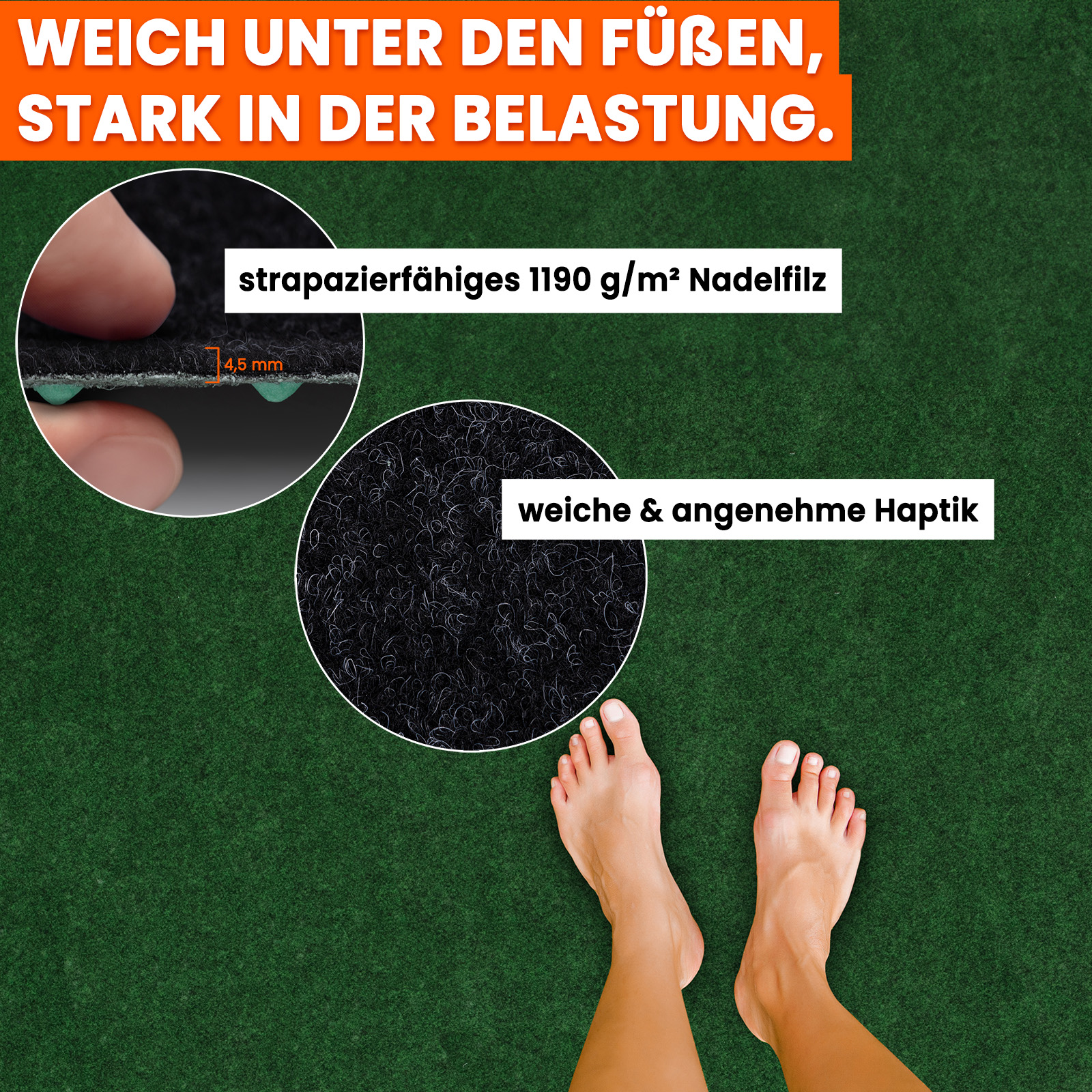 Der Rasenteppich bietet nicht nur eine ansprechende Optik, sondern auch ein angenehmes Trittgefühl. Sein extra weicher Nadelfilz mit 1190 g/m² sorgt für ein behagliches Gefühl unter den Füßen und lädt zum Verweilen ein. Zudem ist der Teppich äußerst strapazierfähig und kann selbst intensiver Nutzung standhalten.