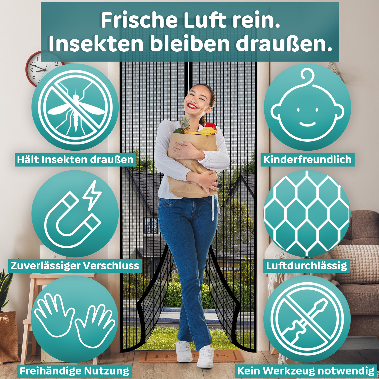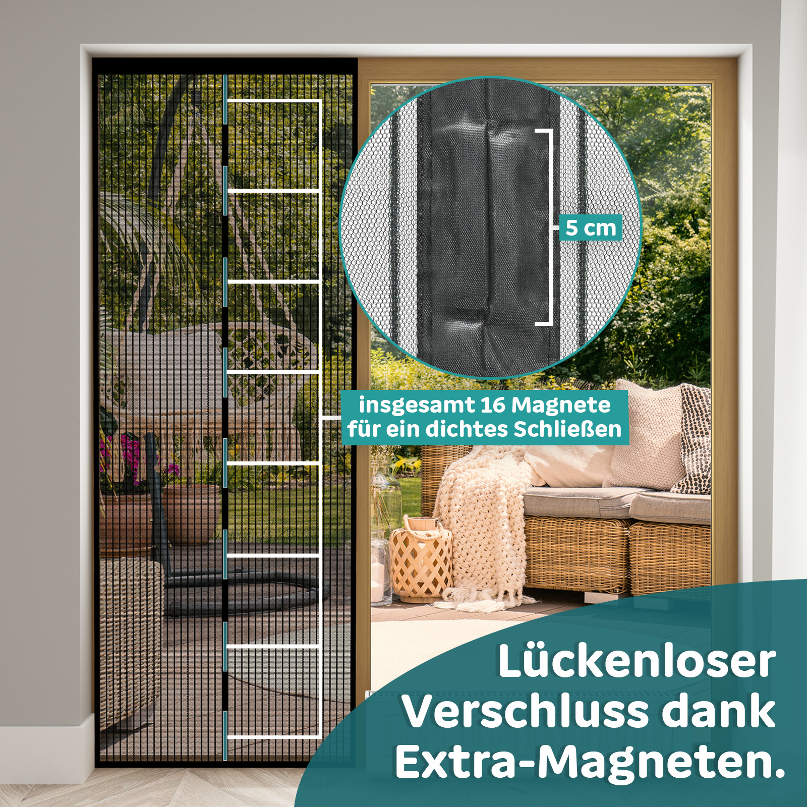 Die Magnete unserer Fliegengitter Tür sind stark und in das Gewebe eingenäht, wodurch sie optisch nicht sichtbar sind. Dies garantiert nicht nur ein ästhetisches Erscheinungsbild, sondern auch eine störungsfreie Nutzung. Der Magnet-Vorhang schließt leise und sicher, ohne die Nachbarn zu stören. Trotz der starken Magnete lässt sich die Fliegengitter Tür jedoch mühelos und sogar freihändig öffnen, was sie ideal für Kinder und Haustiere macht.