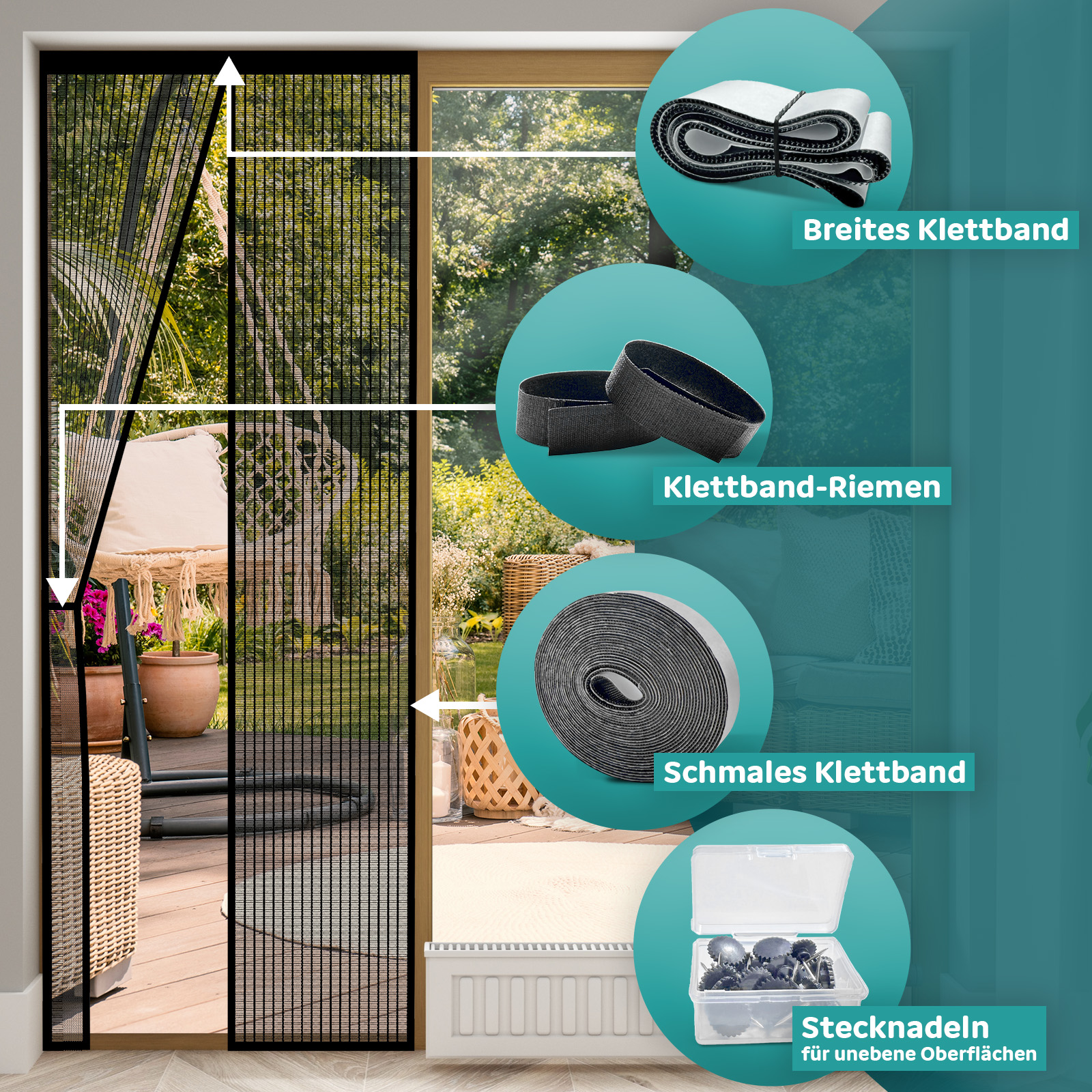 Die Montage der Fliegengitter Tür ist denkbar einfach. Im Lieferumfang sind alle nötigen Utensilien enthalten: Klettband-Klebebänder zum Anbringen, Stecknadeln zum Fixieren, Klettband-Riemen zum Zusammenbinden und eine detaillierte Schritt-für-Schritt-Montageanleitung. Das ist ein großer Vorteil gegenüber vielen Konkurrenzprodukten, bei denen oft nicht alle benötigten Teile mitgeliefert werden und zusätzlich besorgt werden müssen. Außerdem lässt sich der Vorhang schnell entfernen und für den Winter verstauen, um ihn im nächsten Sommer wieder zu nutzen.