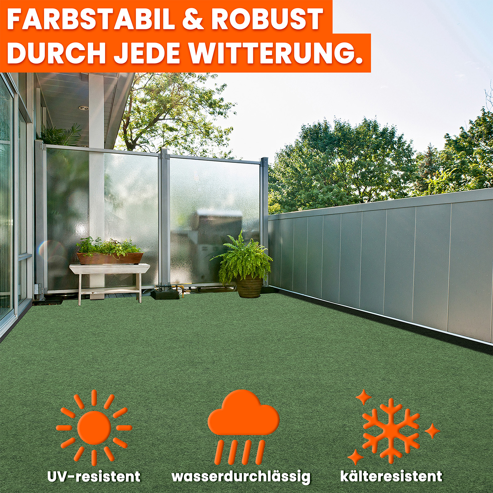 Mit einem Gesamtgewicht von 1490 g/m² und einer Höhe von 6,5 mm bietet dieser Rasenteppich eine solide Grundlage für den täglichen Einsatz. Der dichte Nadelfilz erzeugt ein weiches, angenehmes Gefühl unter den Füßen – ideal für barfußfreundliche Entspannung auf Balkon oder Veranda. Gleichzeitig bleibt der Kunstrasen formstabil und widerstandsfähig, selbst bei regelmäßiger Belastung durch Möbel oder Fußverkehr.