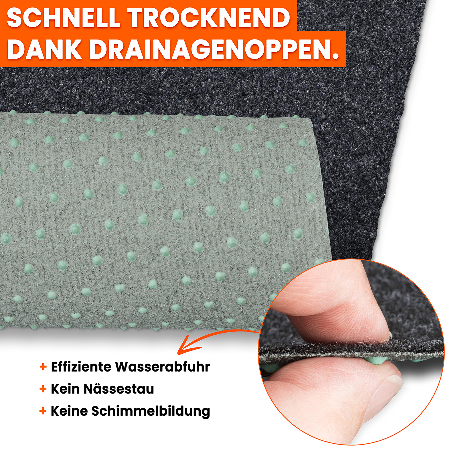 Besonders hervorzuheben ist die Drainagefunktion des Rasenteppichs. Auf der Rückseite befindet sich ein durchdachtes System aus 2 mm hohen und 6 mm breiten Noppen, die das Wasser zuverlässig ableiten. Die erhöhte Noppenstruktur hebt den Kunstrasen leicht vom Boden ab und ermöglicht ein schnelles Abfließen von Regen – auch auf unebenen Terrassen oder Balkonen. So bleibt der Outdoor-Teppich stets trocken, hygienisch und rutschfest.