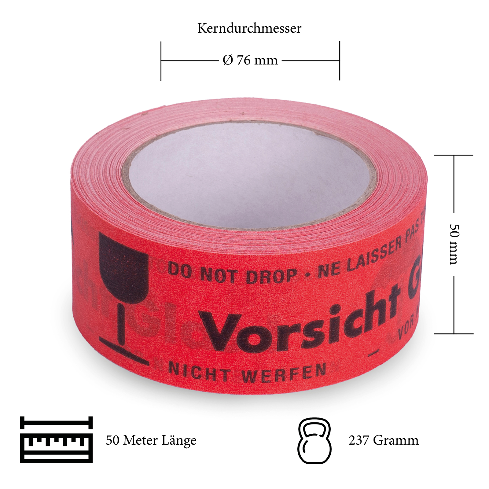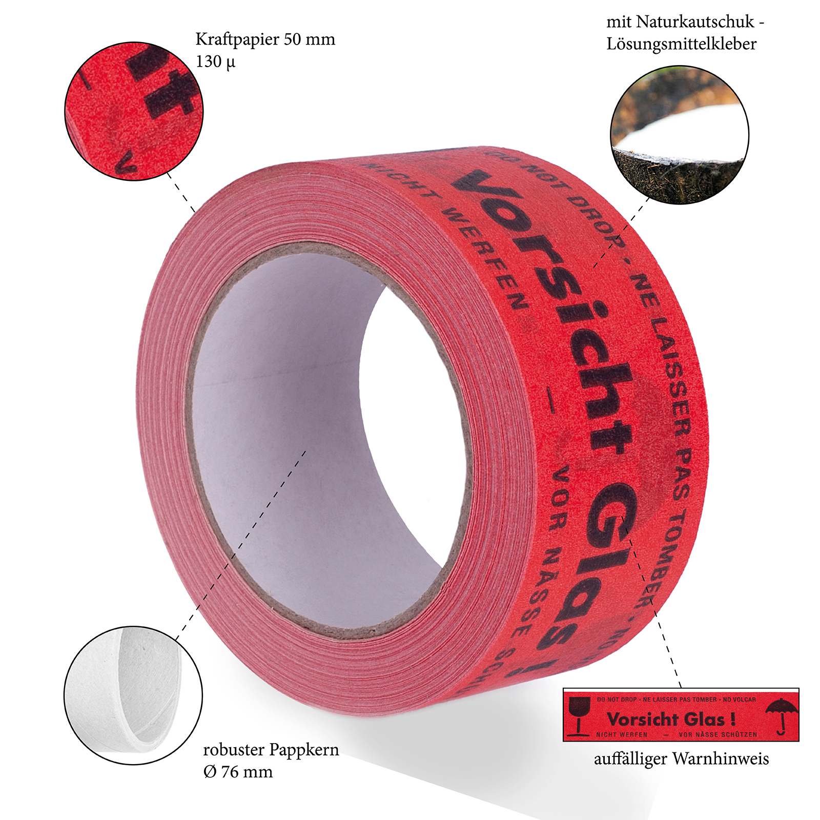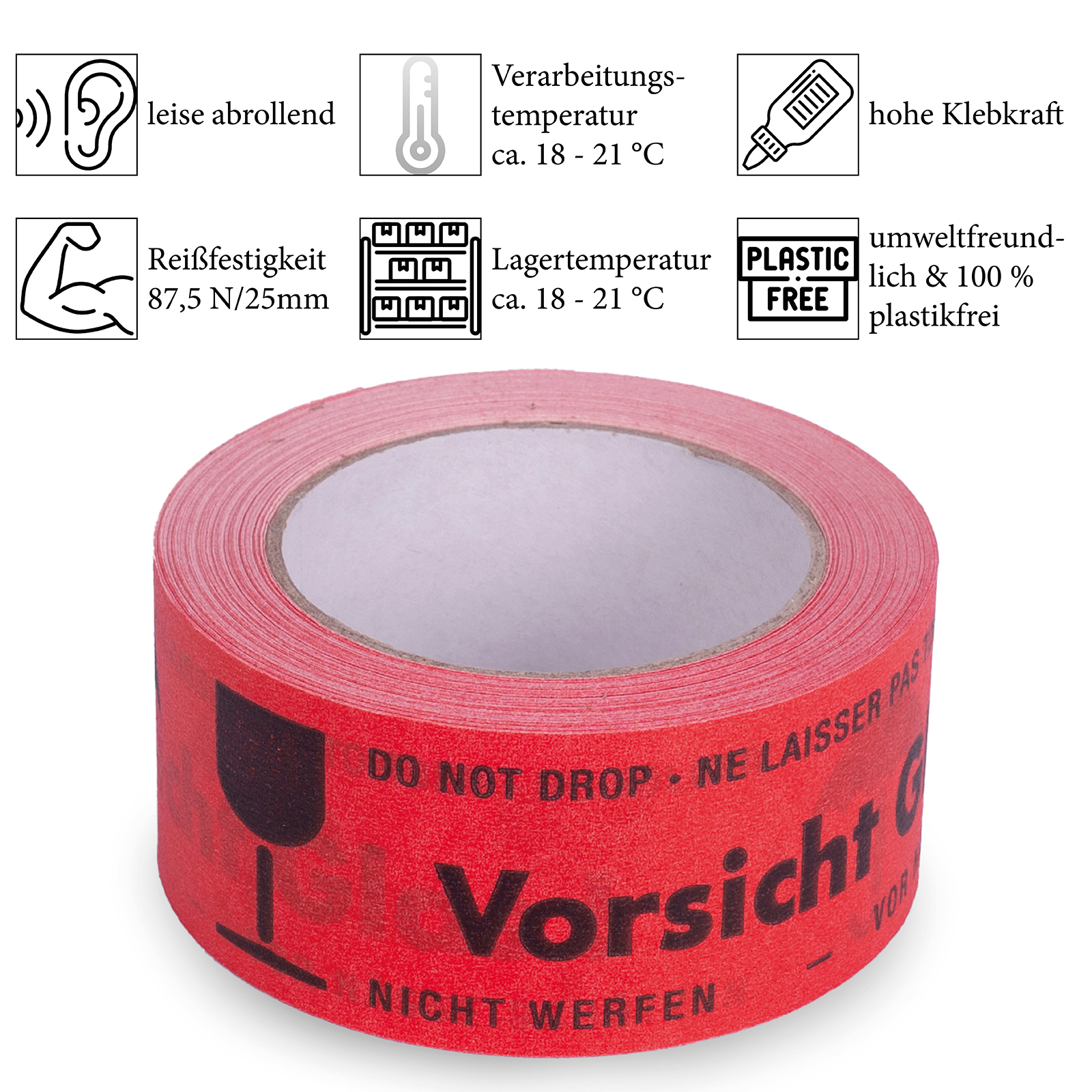 Sie erhalten ein Klebeband, dass nicht nur nachhaltig, sondern auch wirtschaftlich ist. Wenn Sie Ihren Kartoninhalt besonders gut schützen möchten, empfehlen wir Ihnen, Ihren Karton mit besonders empfindlichen Waren, sichtbar zu kennzeichnen. Das geht ganz einfach mit knallrotem Signalband mit der gut sichtbaren Aufschrift „Vorsicht Glas“. Dank der hohen Reißfestigkeit und des starken Trägermaterials können Sie das Warnband wie gewohnt handhaben.