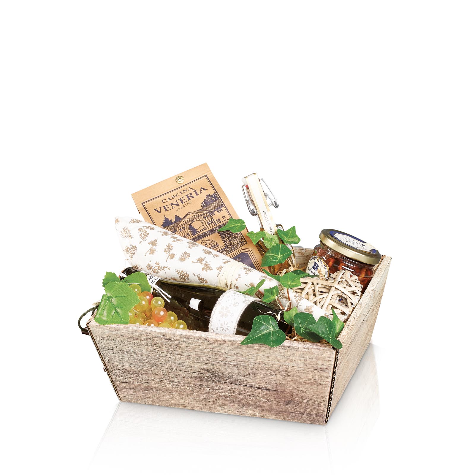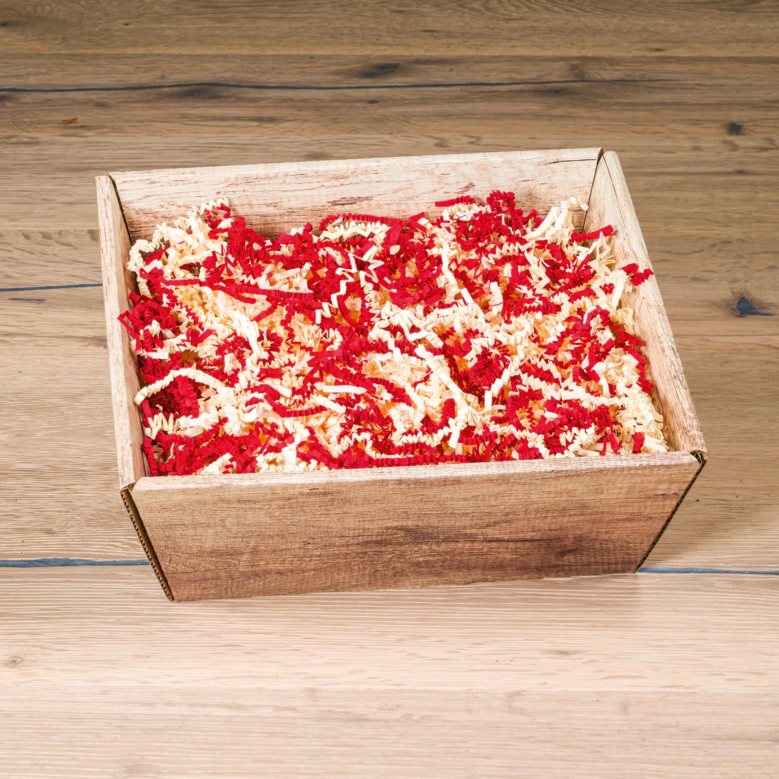 Die natürliche Holzoptik dieses Geschenkkorbes aus Wellpappe ist die optimale Grundlage für viele Geschenkideen. Der Offsetdruck mit Mattlackierung gibt dem Geschenkkarton eine ästhetische Haptik.