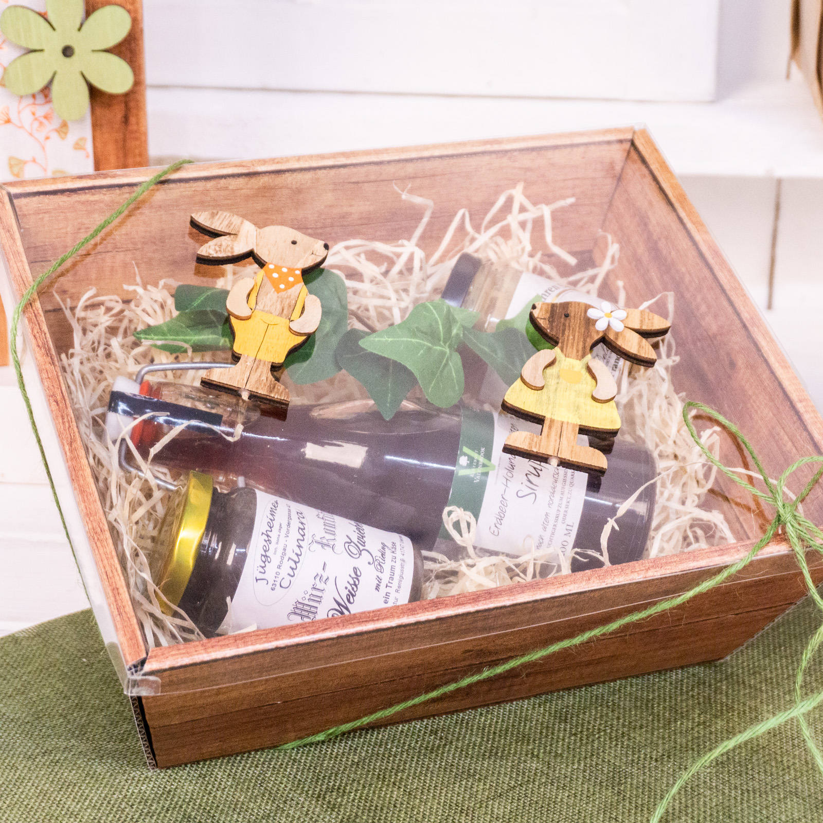 Viereckiger Geschenkkorb in Holzoptik mit natürlichem Designdruck