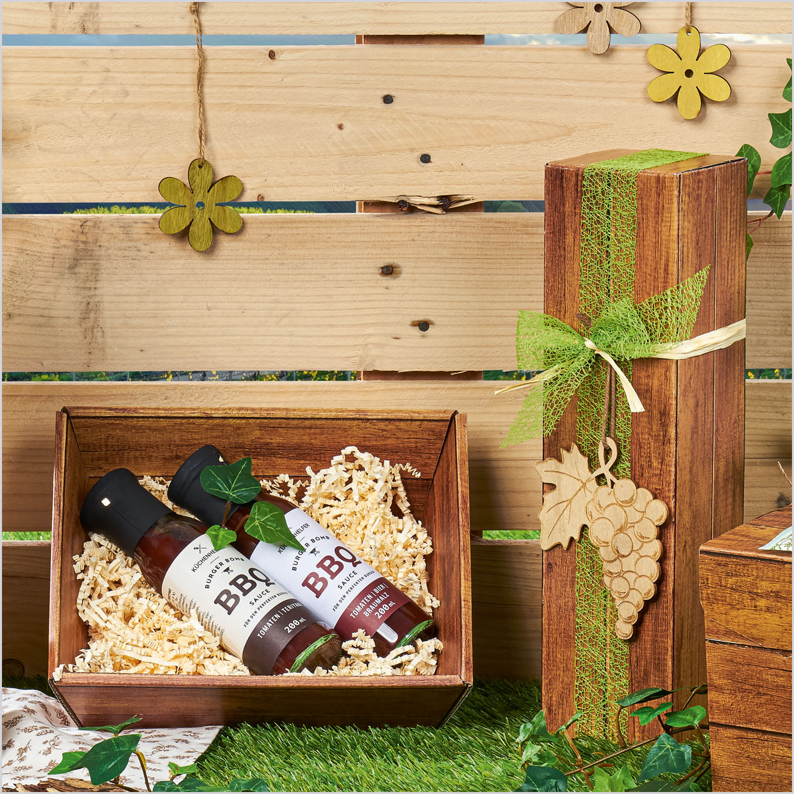 Die natürliche Holzoptik dieses Geschenkkorbes aus Wellpappe ist die optimale Grundlage für viele Geschenkideen. Der Offsetdruck mit Mattlackierung gibt dem Geschenkkarton eine ästhetische Haptik.