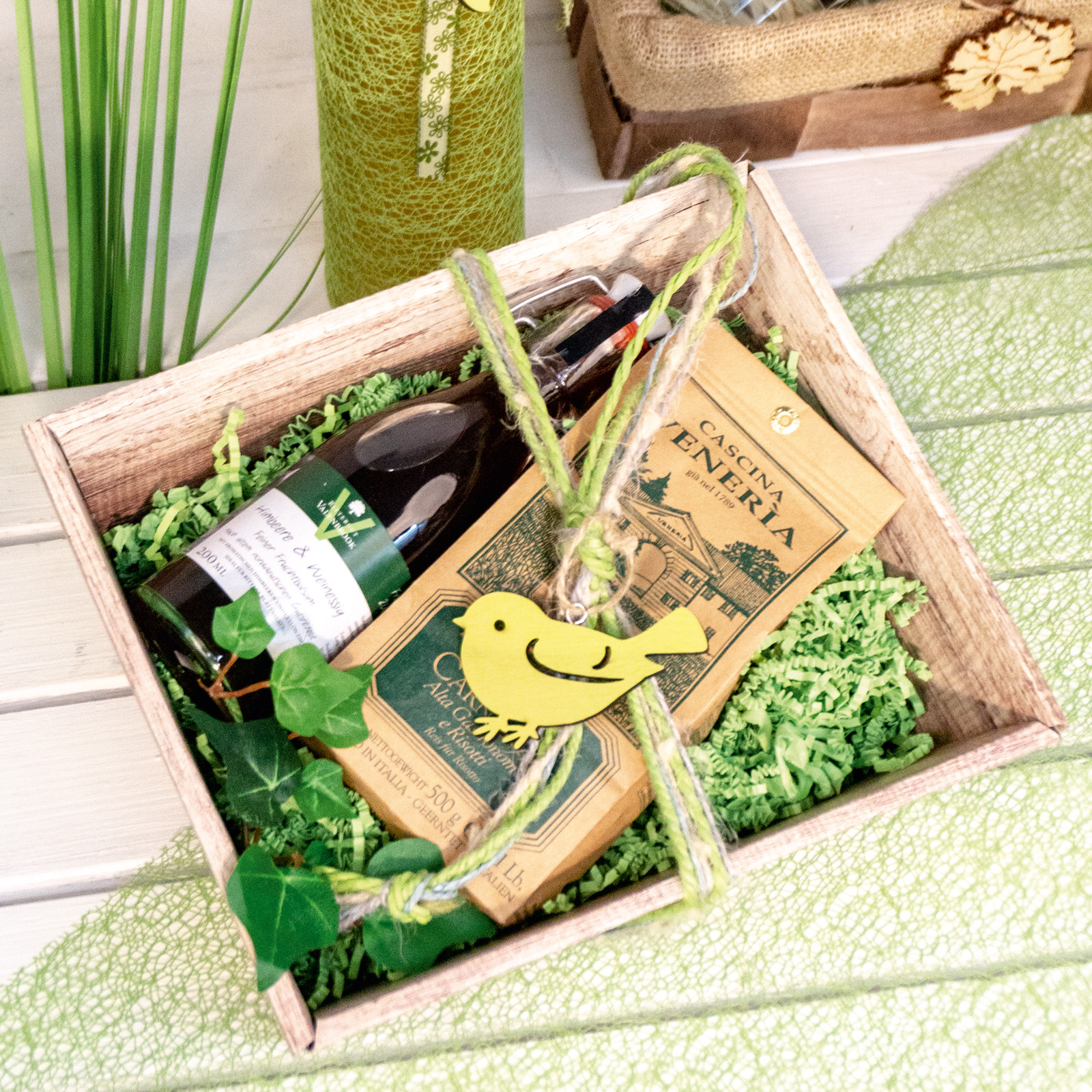 Viereckiger Geschenkkorb in Holzoptik mit natürlichem Designdruck