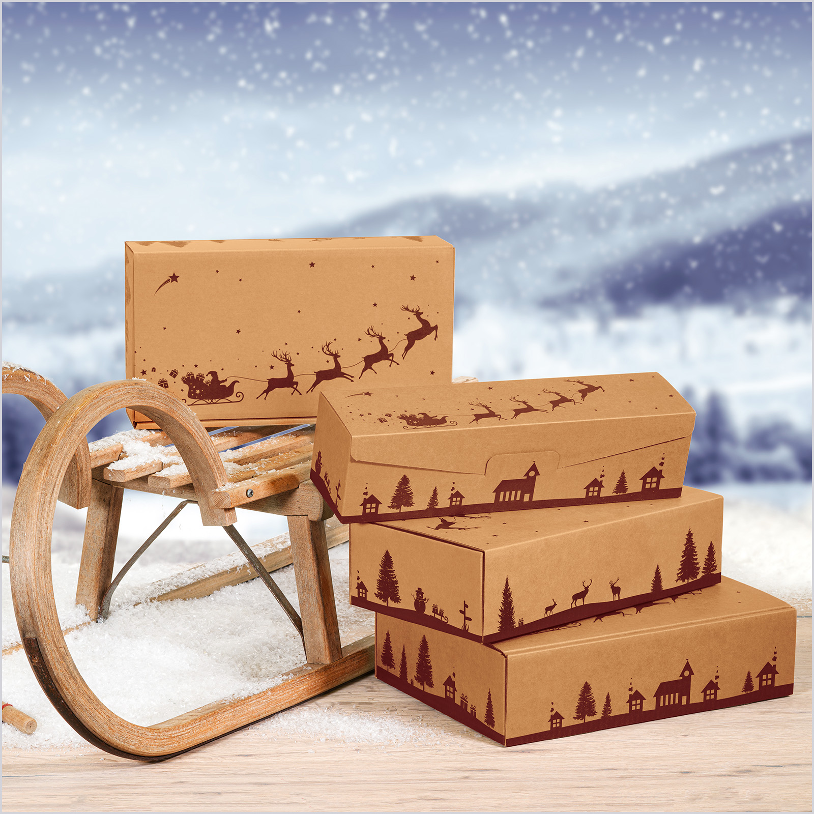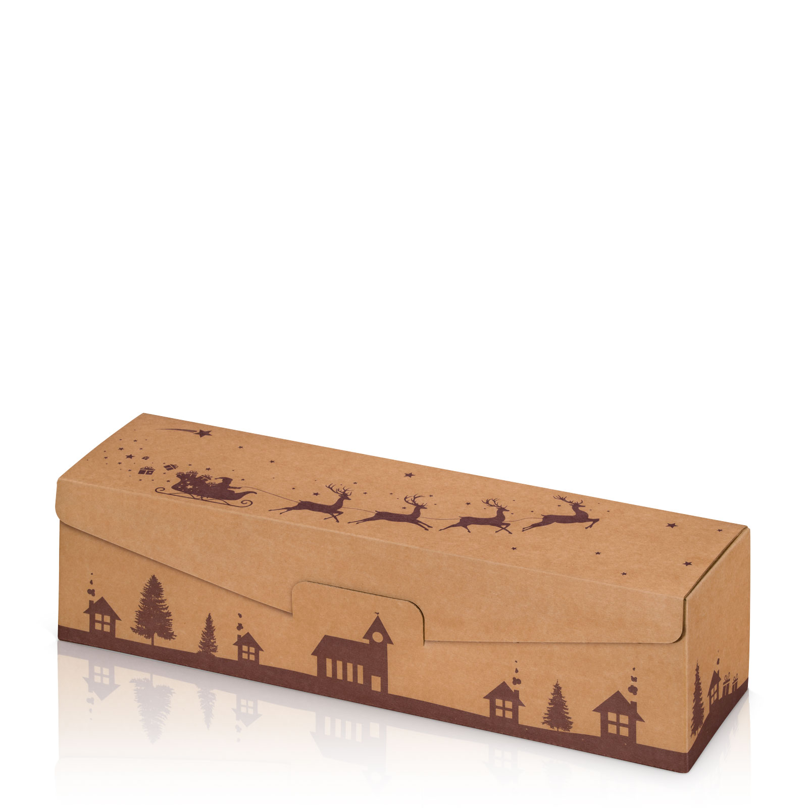 Mit dieser Verpackung wird die Nachhaltigkeit unserer Produkte besonders betont. Das Motiv "Natura Weihnachtsschlitten" basiert auf unserer Natura-Serie und ist rundum mit einer zauberhaften Winterlandschaft bedruckt. Viele Details wie Häuser, Tannenbäume, Schneemänner und Geschenke sind rund um diese Verpackung zu entdecken. Auf dem Deckel ist ein Schlitten mit dem Weihnachtsmann und Rentieren abgebildet. Das Innere sowie der separate Einsatz sind ebenfalls naturbraun!
