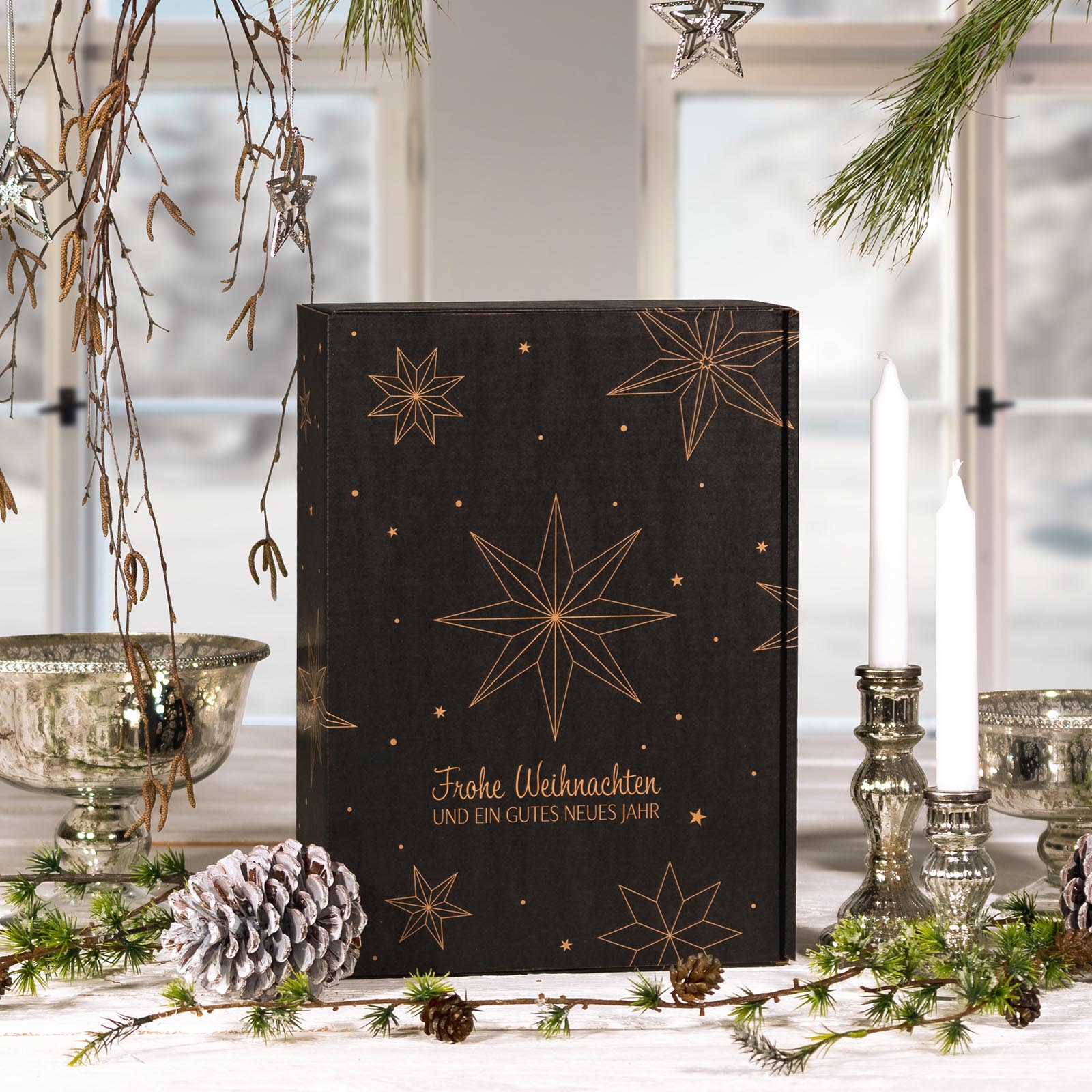 Mit dieser Verpackung wird die Nachhaltigkeit unserer Produkte besonders betont. Der Geschenkkarton "Natura Weihnachtssterne" ist eine Verpackung aus unserer Natura-Serie mit einem stimmungsvollen Druck. Das Motiv entsteht durch Aussparungen in der schwarzen Farbe. Das Innere sowie der separate Einsatz sind ebenfalls naturbraun!