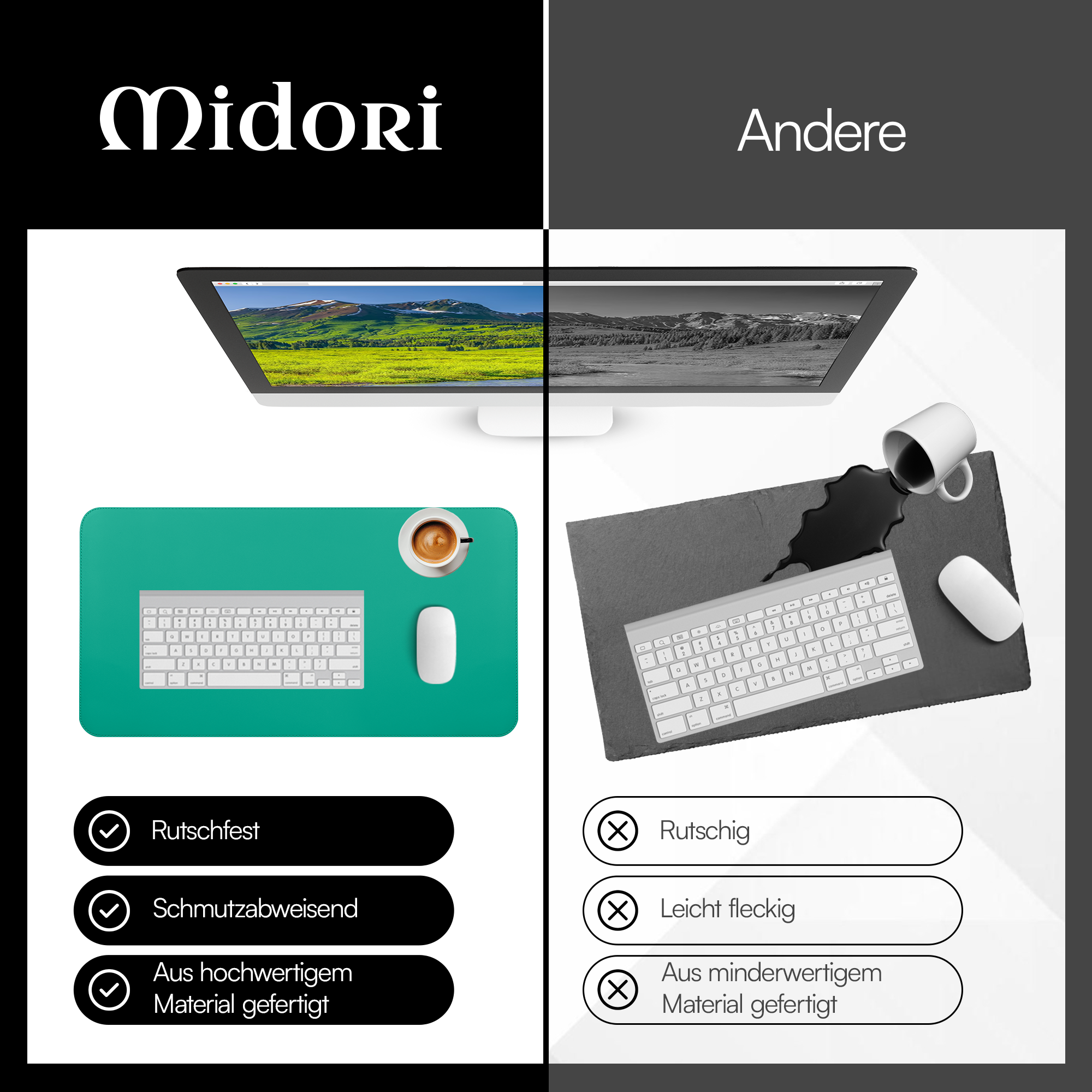 Die Midori Schreibtischunterlage schützt Ihren Schreibtisch effektiv vor Abnutzung, Hitze, Flüssigkeiten und Kratzern. Die wasser- und schmutzabweisende Oberfläche macht sie ideal für den täglichen Einsatz mit Laptop, Tastatur, Maus und weiteren Arbeitsutensilien. Zudem verhindert die rutschfeste Unterseite aus Kunstwildleder, dass die Schreibtischunterlage auf glatten Oberflächen verrutscht. Damit bleibt Ihre Arbeitsfläche nicht nur optisch ansprechend, sondern auch dauerhaft in einwandfreiem Zustand.