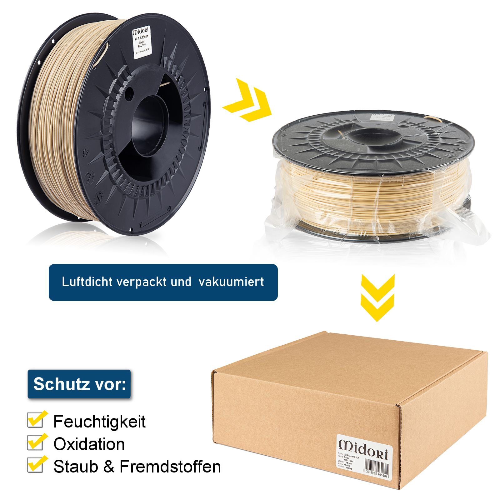 Unsere Midori 3D-Filamente sind auf extrem hochwertigen transparenten Spulen gewickelt, die anders als herkömmliche minderwertige Spulen für optimale Druckresultate auch beheizt werden können. Jede Spule ist mit Informationen über die Materialart, die Farbe (gegebenenfalls mit Angabe der RAL-Nummer), den Durchmesser und die Drucktemperatur versehen. Zum Schutz vor Staub und Fremdstoffen werden die Midori 3D-Filamente anders als herkömmliche Konkurrenzfilamente mit einem Feuchtigkeitsschutz-Beutel in einer wiederverschließbaren feuchtigkeits- und lichtundurchlässigen Aluminiumpackung vakuumversiegelt, womit optimale Lagerbedingungen geschaffen werden. Damit der optimale Zustand der Filamente bei ihrer Ankunft sichergestellt werden kann, werden die Spulen jeweils in eingeschweißten Umkartons verpackt.