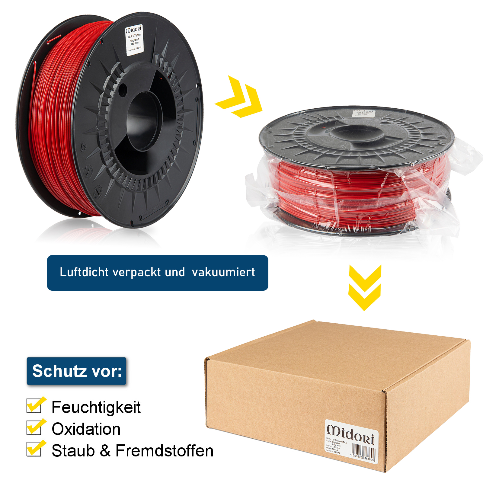 Unsere Midori 3D-Filamente sind auf extrem hochwertigen transparenten Spulen gewickelt, die anders als herkömmliche minderwertige Spulen für optimale Druckresultate auch beheizt werden können. Jede Spule ist mit Informationen über die Materialart, die Farbe (gegebenenfalls mit Angabe der RAL-Nummer), den Durchmesser und die Drucktemperatur versehen. Zum Schutz vor Staub und Fremdstoffen werden die Midori 3D-Filamente anders als herkömmliche Konkurrenzfilamente mit einem Feuchtigkeitsschutz-Beutel in einer wiederverschließbaren feuchtigkeits- und lichtundurchlässigen Aluminiumpackung vakuumversiegelt, womit optimale Lagerbedingungen geschaffen werden. Damit der optimale Zustand der Filamente bei ihrer Ankunft sichergestellt werden kann, werden die Spulen jeweils in eingeschweißten Umkartons verpackt.