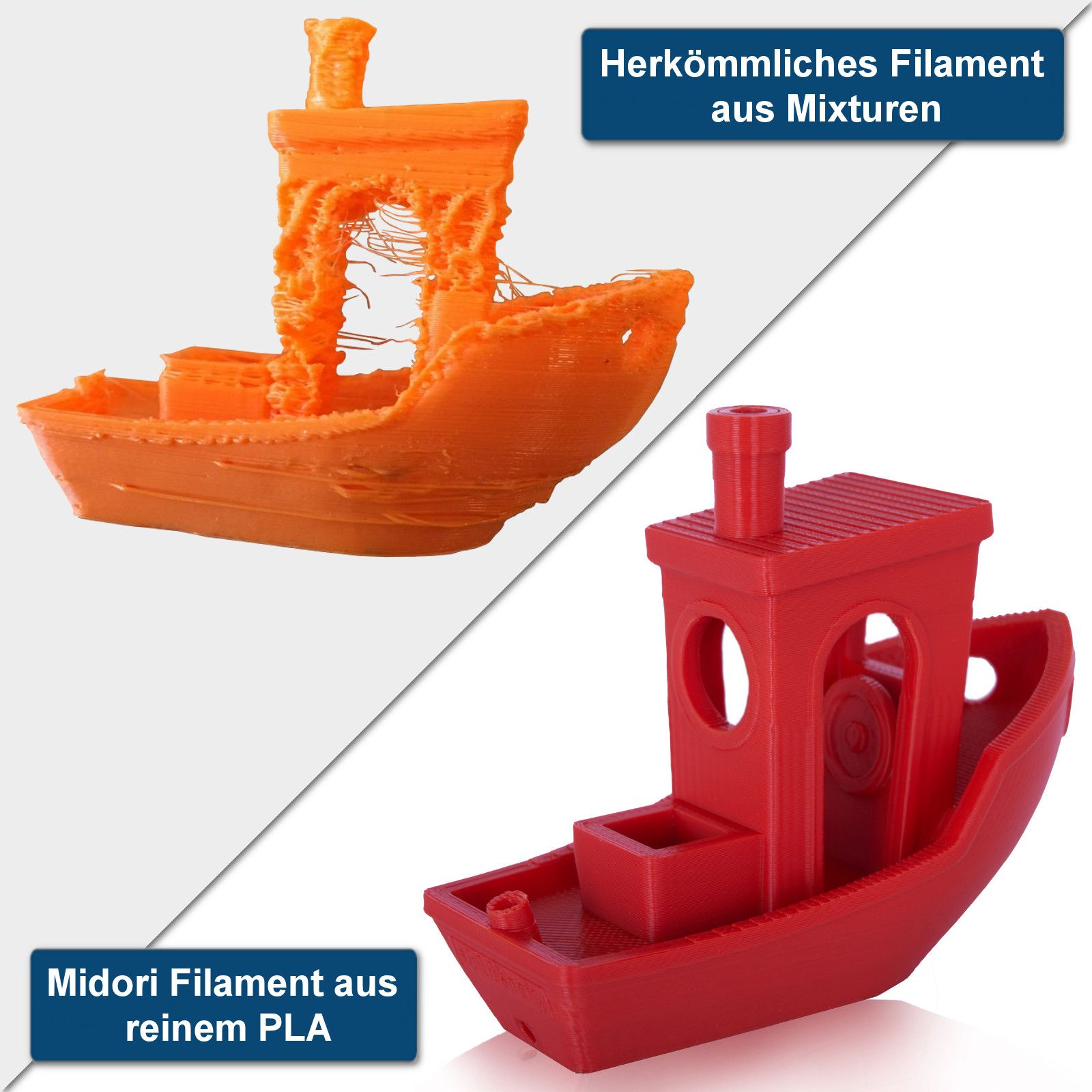 Unsere Midori PLA 3D-Filamente bestehen im Unterschied zu herkömmlichen PLA Konkurrenzprodukten aus reiner PLA (Polylactic Acid/Polymilchsäure). Die reine PLA hat gegenüber herkömmlichen Mixturen den Vorteil einer besseren Formgebung ohne Blasenbildung, Verstopfen oder Verziehen. Somit werden Ihnen glatte Ausdrucke mit hervorragender Schichthaftung und hoher Steifigkeit ermöglicht.