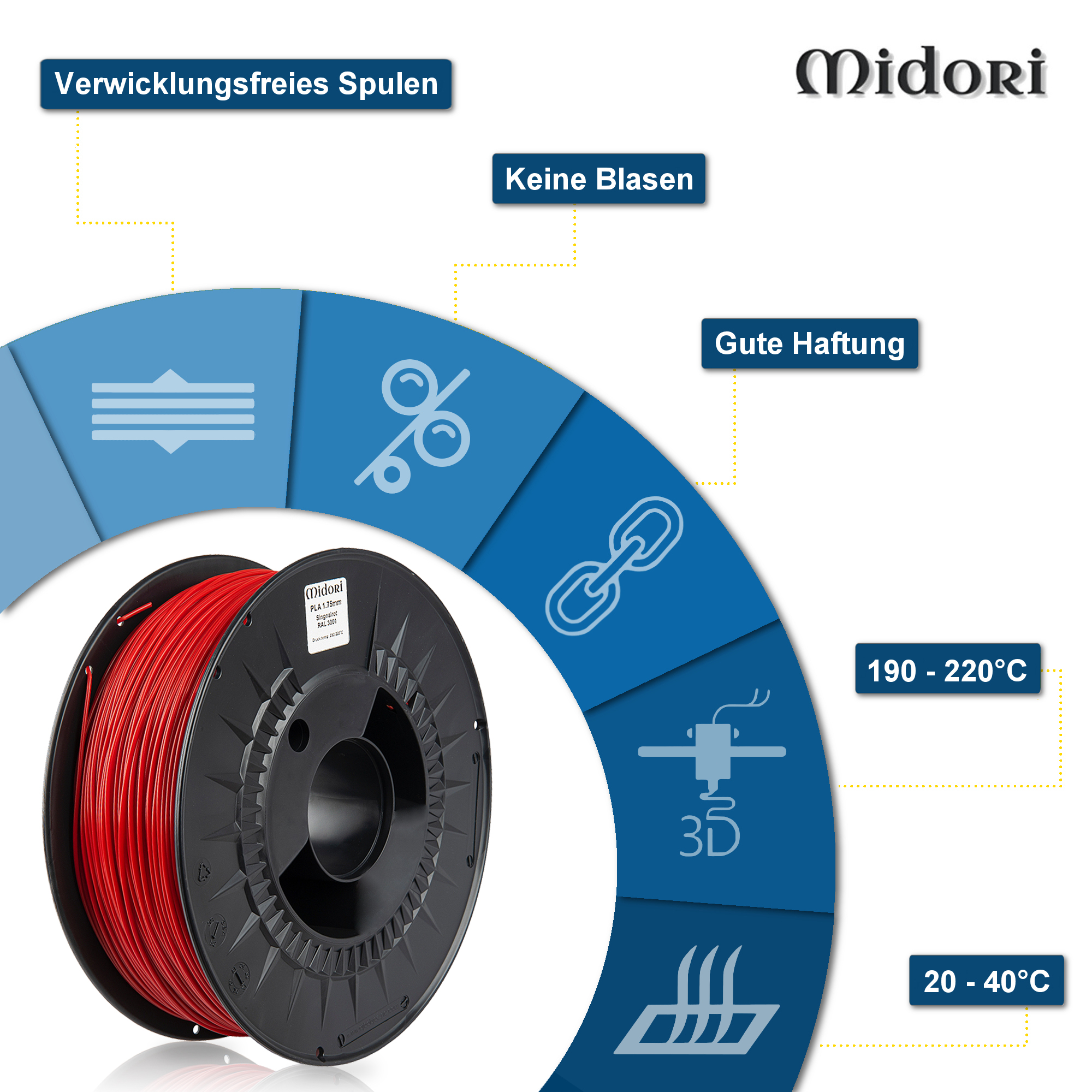 Unsere Midori PLA 3D-Filamente bestehen im Unterschied zu herkömmlichen PLA Konkurrenzprodukten aus reiner PLA (Polylactic Acid/Polymilchsäure). Die reine PLA hat gegenüber herkömmlichen Mixturen den Vorteil einer besseren Formgebung ohne Blasenbildung, Verstopfen oder Verziehen. Somit werden Ihnen glatte Ausdrucke mit hervorragender Schichthaftung und hoher Steifigkeit ermöglicht.