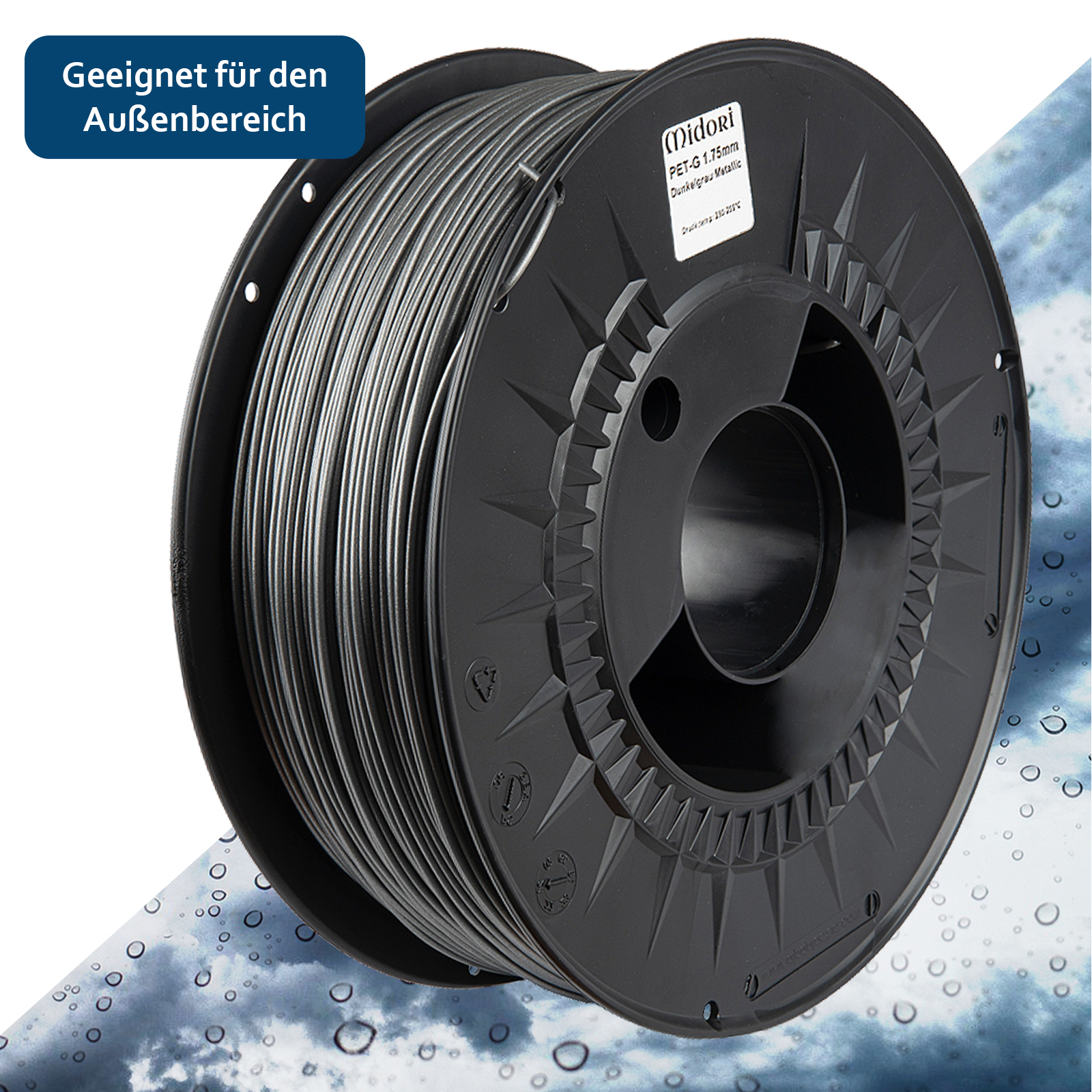 Die Midori PETG 3D-Filamente werden aus mit Glykol modifiziertem PET (Polyethylenterephthalat) gefertigt. Das in den Filamenten enthaltene Glykol hat niederviskose Eigenschaften, die den Druckprozess schneller und einfacher ablaufen lassen. Bei dem zugleich zähen, elastischen und extrem bruchfesten PETG Filamenten handelt es sich um einen insgesamt zuverlässigen Kunststoff, der im Vergleich zu PLA und ABS witterungsbeständig ist und sich somit auch für den Außenbereich eignet. Außerdem bringt PETG den Vorteil mit sich, dass diese im Unterschied zu anderen Kunststoffen völlig geruchsneutral ist.