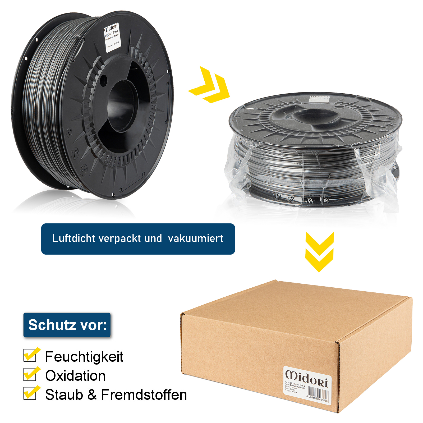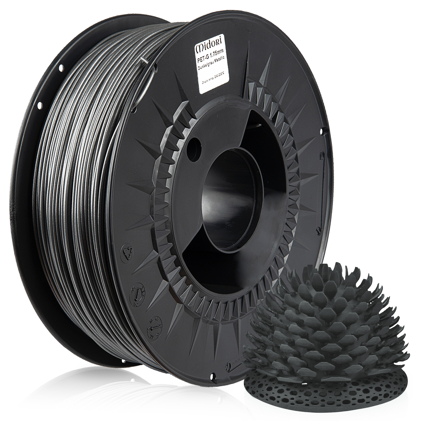 Die Midori PETG 3D-Filamente werden aus mit Glykol modifiziertem PET (Polyethylenterephthalat) gefertigt. Das in den Filamenten enthaltene Glykol hat niederviskose Eigenschaften, die den Druckprozess schneller und einfacher ablaufen lassen. Bei dem zugleich zähen, elastischen und extrem bruchfesten PETG Filamenten handelt es sich um einen insgesamt zuverlässigen Kunststoff, der im Vergleich zu PLA und ABS witterungsbeständig ist und sich somit auch für den Außenbereich eignet. Außerdem bringt PETG den Vorteil mit sich, dass diese im Unterschied zu anderen Kunststoffen völlig geruchsneutral ist.