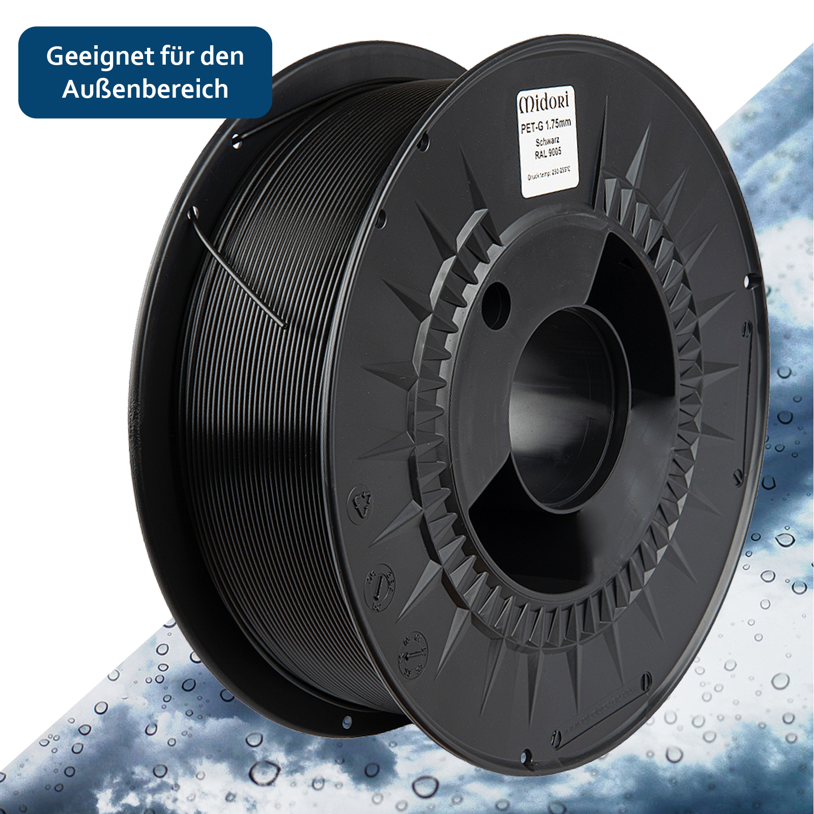 Die Midori PETG 3D-Filamente werden aus mit Glykol modifiziertem PET (Polyethylenterephthalat) gefertigt. Das in den Filamenten enthaltene Glykol hat niederviskose Eigenschaften, die den Druckprozess schneller und einfacher ablaufen lassen. Bei dem zugleich zähen, elastischen und extrem bruchfesten PETG Filamenten handelt es sich um einen insgesamt zuverlässigen Kunststoff, der im Vergleich zu PLA und ABS witterungsbeständig ist und sich somit auch für den Außenbereich eignet. Außerdem bringt PETG den Vorteil mit sich, dass diese im Unterschied zu anderen Kunststoffen völlig geruchsneutral ist.