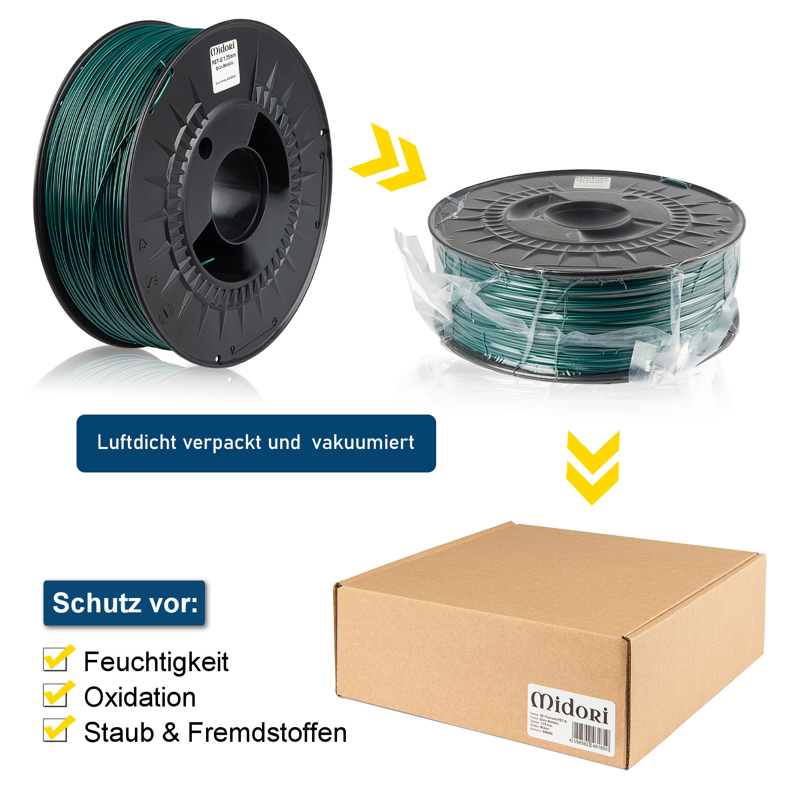 Unsere Midori 3D-Filamente sind auf extrem hochwertigen transparenten Spulen gewickelt, die anders als herkömmliche minderwertige Spulen für optimale Druckresultate auch beheizt werden können. Jede Spule ist mit Informationen über die Materialart, die Farbe (gegebenenfalls mit Angabe der RAL-Nummer), den Durchmesser und die Drucktemperatur versehen. Zum Schutz vor Staub und Fremdstoffen werden die Midori 3D-Filamente anders als herkömmliche Konkurrenzfilamente mit einem Feuchtigkeitsschutz-Beutel in einer wiederverschließbaren feuchtigkeits- und lichtundurchlässigen Aluminiumpackung vakuumversiegelt, womit optimale Lagerbedingungen geschaffen werden. Damit der optimale Zustand der Filamente bei ihrer Ankunft sichergestellt werden kann, werden die Spulen jeweils in eingeschweißten Umkartons verpackt.