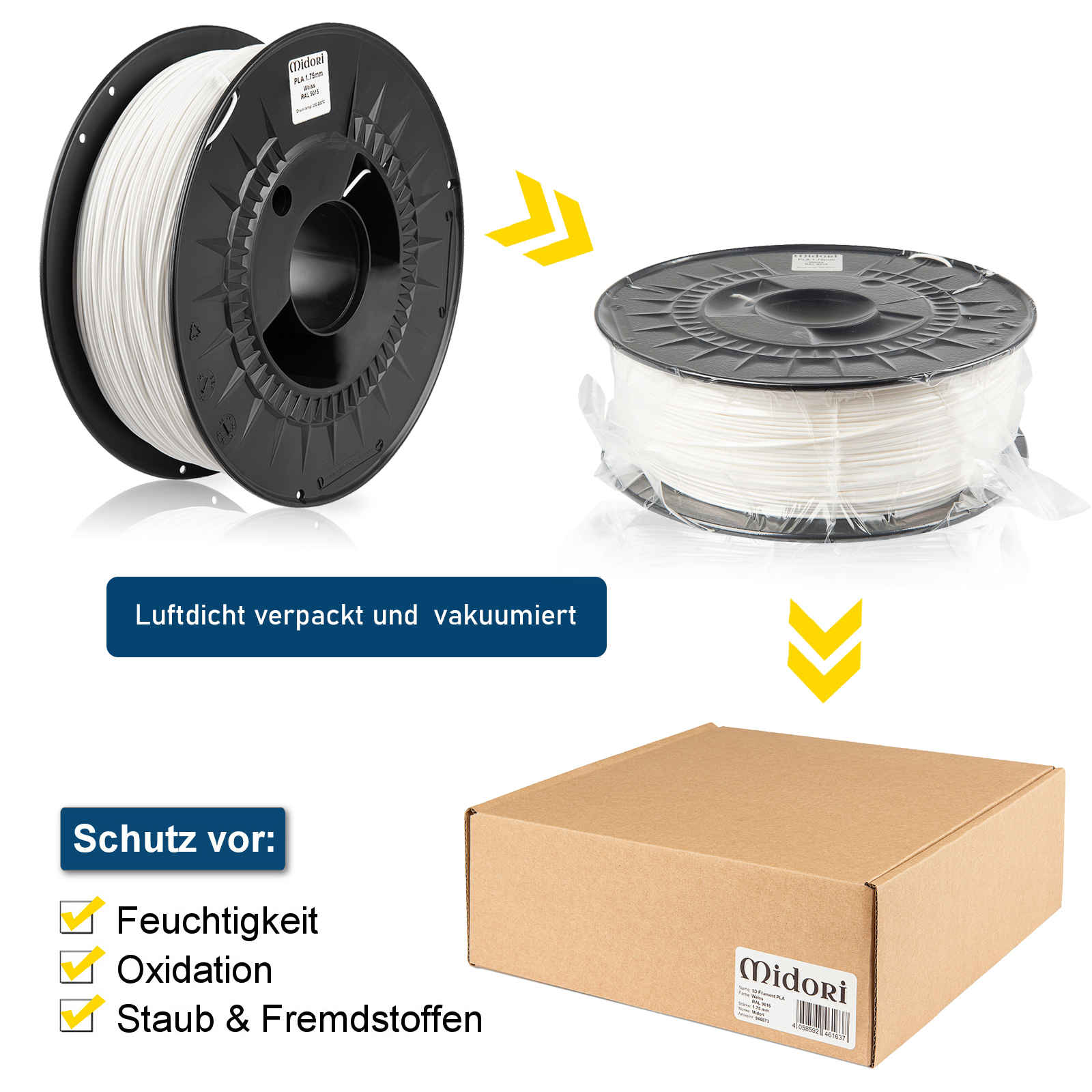 Unsere Midori 3D-Filamente sind auf extrem hochwertigen transparenten Spulen gewickelt, die anders als herkömmliche minderwertige Spulen für optimale Druckresultate auch beheizt werden können. Jede Spule ist mit Informationen über die Materialart, die Farbe (gegebenenfalls mit Angabe der RAL-Nummer), den Durchmesser und die Drucktemperatur versehen. Zum Schutz vor Staub und Fremdstoffen werden die Midori 3D-Filamente anders als herkömmliche Konkurrenzfilamente mit einem Feuchtigkeitsschutz-Beutel in einer wiederverschließbaren feuchtigkeits- und lichtundurchlässigen Aluminiumpackung vakuumversiegelt, womit optimale Lagerbedingungen geschaffen werden. Damit der optimale Zustand der Filamente bei ihrer Ankunft sichergestellt werden kann, werden die Spulen jeweils in eingeschweißten Umkartons verpackt.