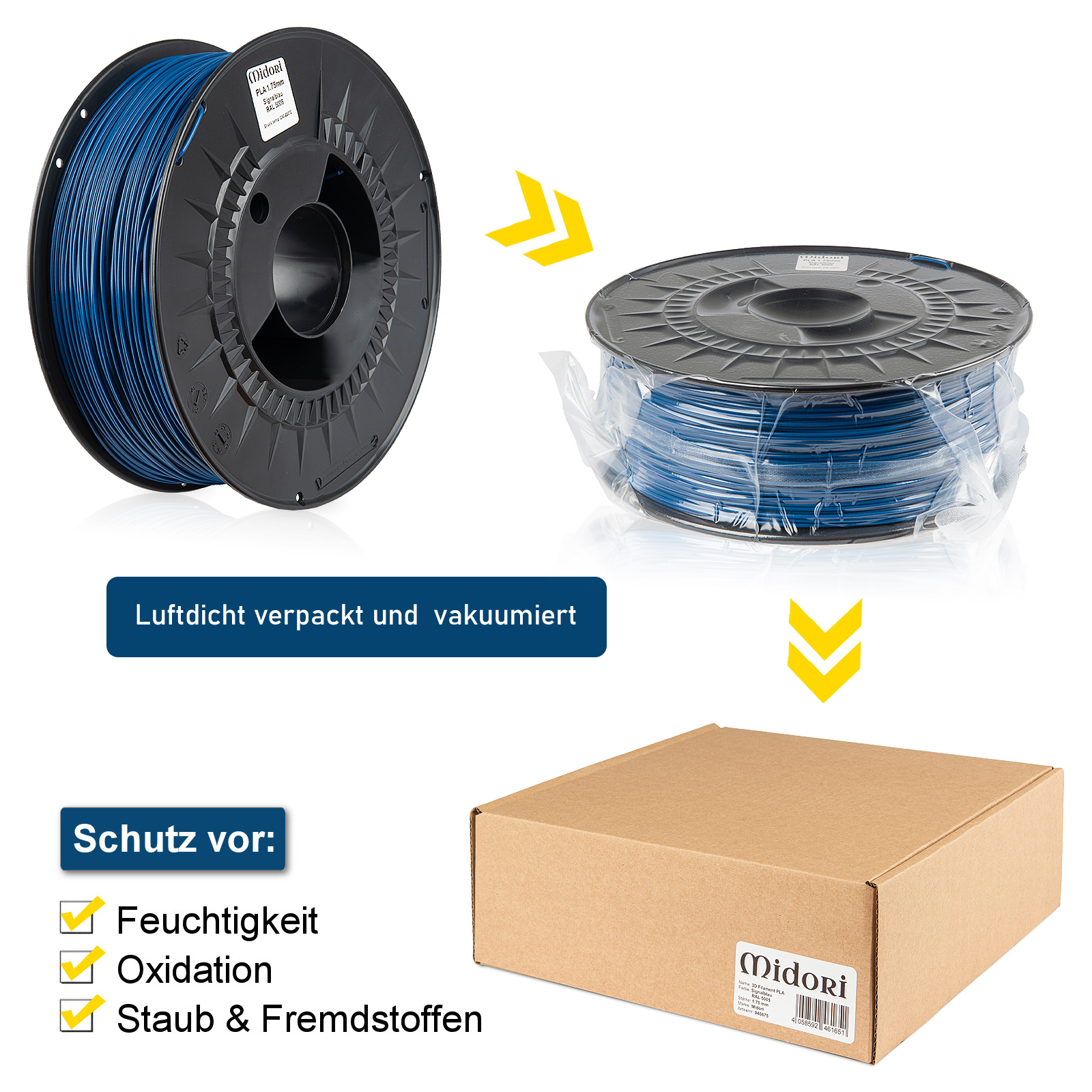 Unsere Midori 3D-Filamente sind auf extrem hochwertigen transparenten Spulen gewickelt, die anders als herkömmliche minderwertige Spulen für optimale Druckresultate auch beheizt werden können. Jede Spule ist mit Informationen über die Materialart, die Farbe (gegebenenfalls mit Angabe der RAL-Nummer), den Durchmesser und die Drucktemperatur versehen. Zum Schutz vor Staub und Fremdstoffen werden die Midori 3D-Filamente anders als herkömmliche Konkurrenzfilamente mit einem Feuchtigkeitsschutz-Beutel in einer wiederverschließbaren feuchtigkeits- und lichtundurchlässigen Aluminiumpackung vakuumversiegelt, womit optimale Lagerbedingungen geschaffen werden. Damit der optimale Zustand der Filamente bei ihrer Ankunft sichergestellt werden kann, werden die Spulen jeweils in eingeschweißten Umkartons verpackt.