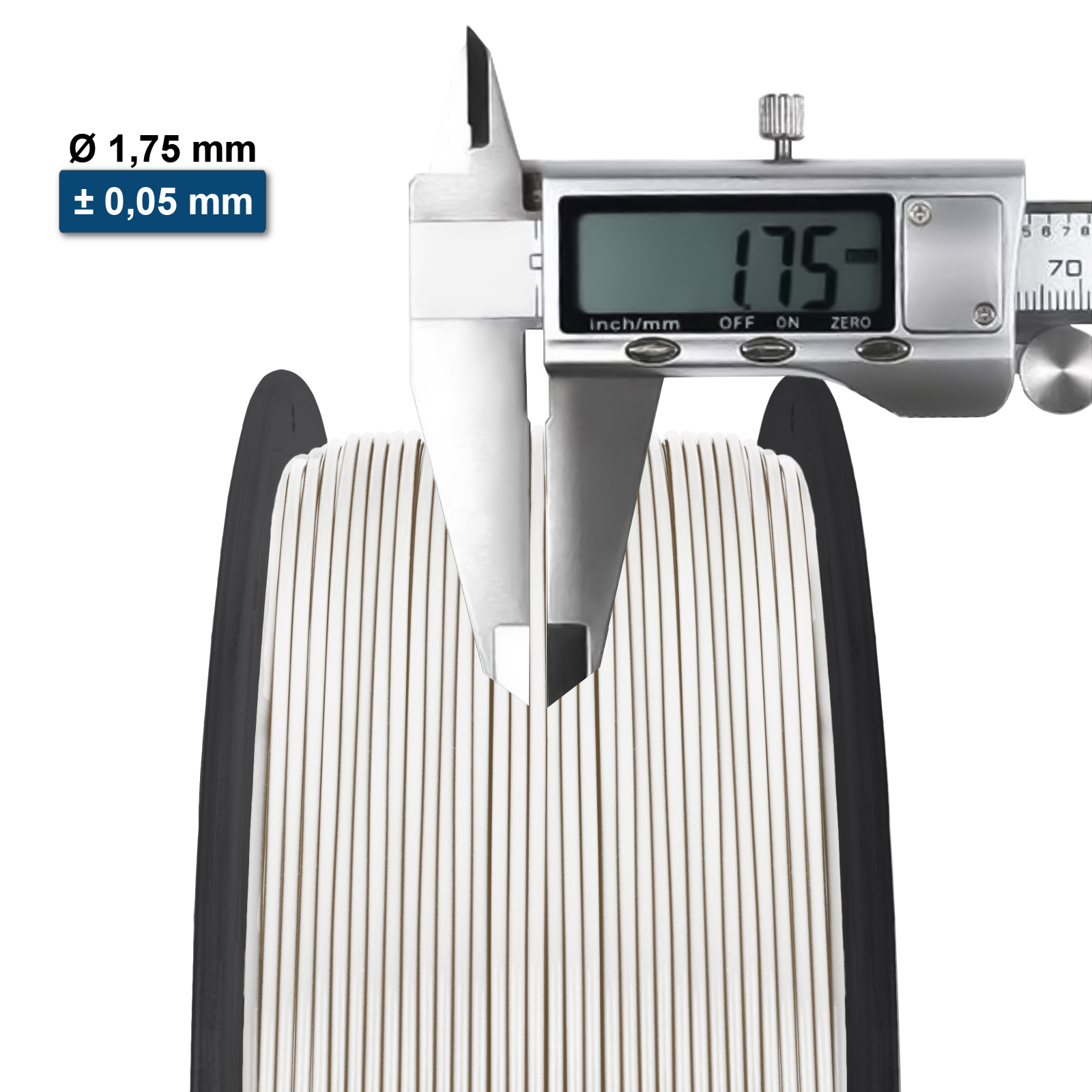 Mit unseren 1,75 mm PLA 3D-Filamenten setzen wir auf höchste Präzision im gesamten Produktionsprozess. Die Herstellung der Filamente erfolgt unter strengsten Prüfungsmechanismen, sodass der Durchmesser der hochwertigen Filamente in jedem Zentimeter eine Toleranz von nur +/- 0,05 mm aufweist. Der daraus entstehende nahezu konstante Filament-Durchmesser verhindert Verstauungen und sorgt für ein reibungsloses Drucken ohne Unterbrechungen, woraus beim Drucken eine minimale Schrumpfung, stärkere Schichthaftung, sowie eine glattere Oberfläche resultieren.