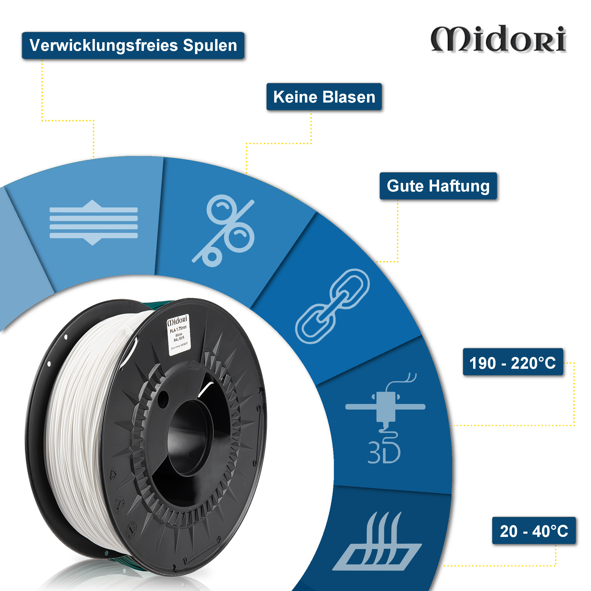 Unsere Midori 3D-Filamente zeichnen sich durch eine sauber gewickelte Spule, eine perfekte Rundheit, sowie umfassende Kompatibilität mit verschiedenen FDM-3D-Druckern und -Stiften aus. Somit profitieren Sie mit unseren Filamenten von reibungslosen Drucksitzungen, sowie hervorragenden Druckresultaten.