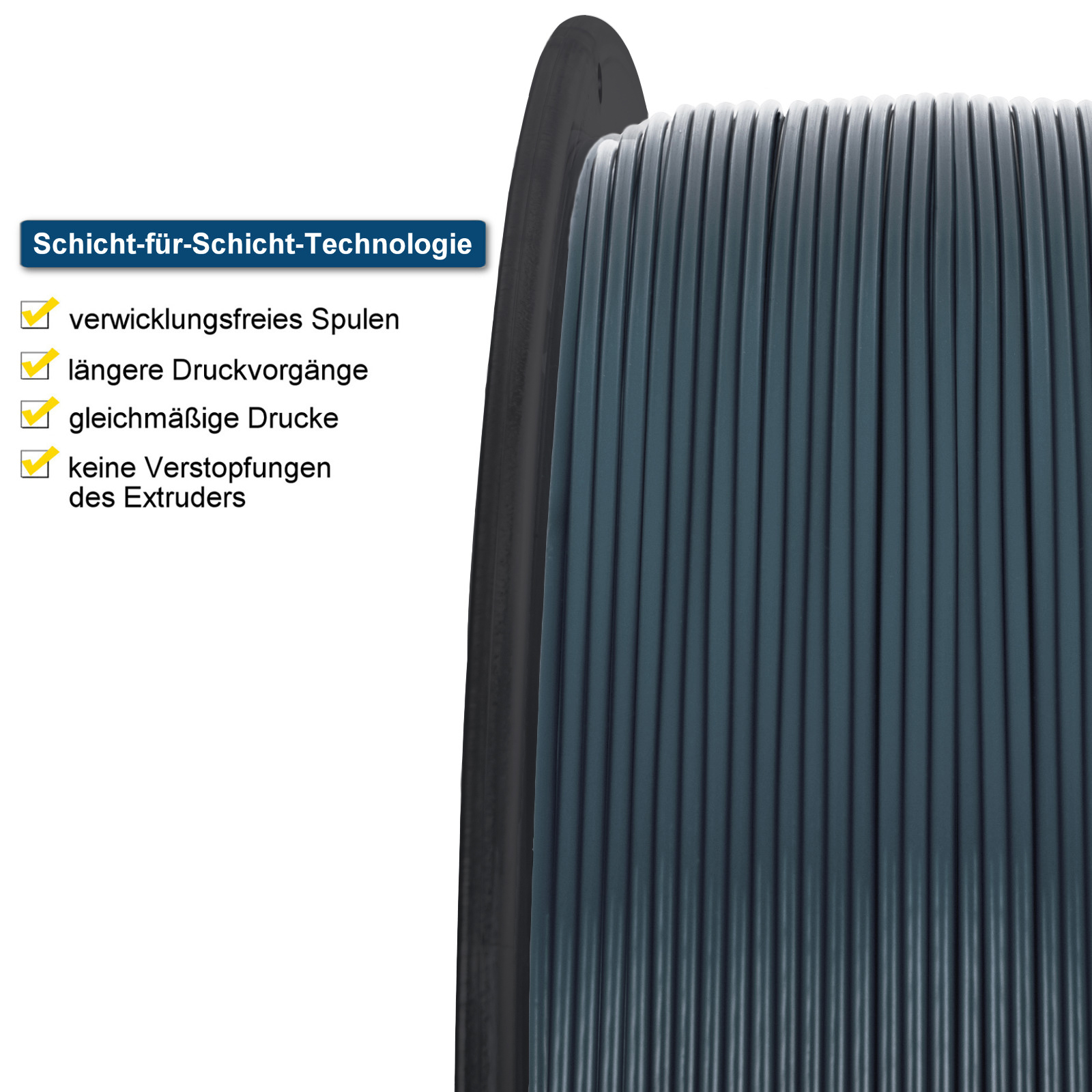 Mit unseren 1,75 mm PETG 3D-Filamenten setzen wir auf höchste Präzision im gesamten Produktionsprozess. Die Herstellung der Filamente erfolgt unter strengsten Prüfungsmechanismen, sodass der Durchmesser der hochwertigen Filamente in jedem Zentimeter eine Toleranz von nur +/- 0,05 mm aufweist. Der daraus entstehende nahezu konstante Filament-Durchmesser verhindert Verstauungen und sorgt für ein reibungsloses Drucken ohne Unterbrechungen, woraus beim Drucken eine minimale Schrumpfung, stärkere Schichthaftung, sowie eine glattere Oberfläche resultieren.