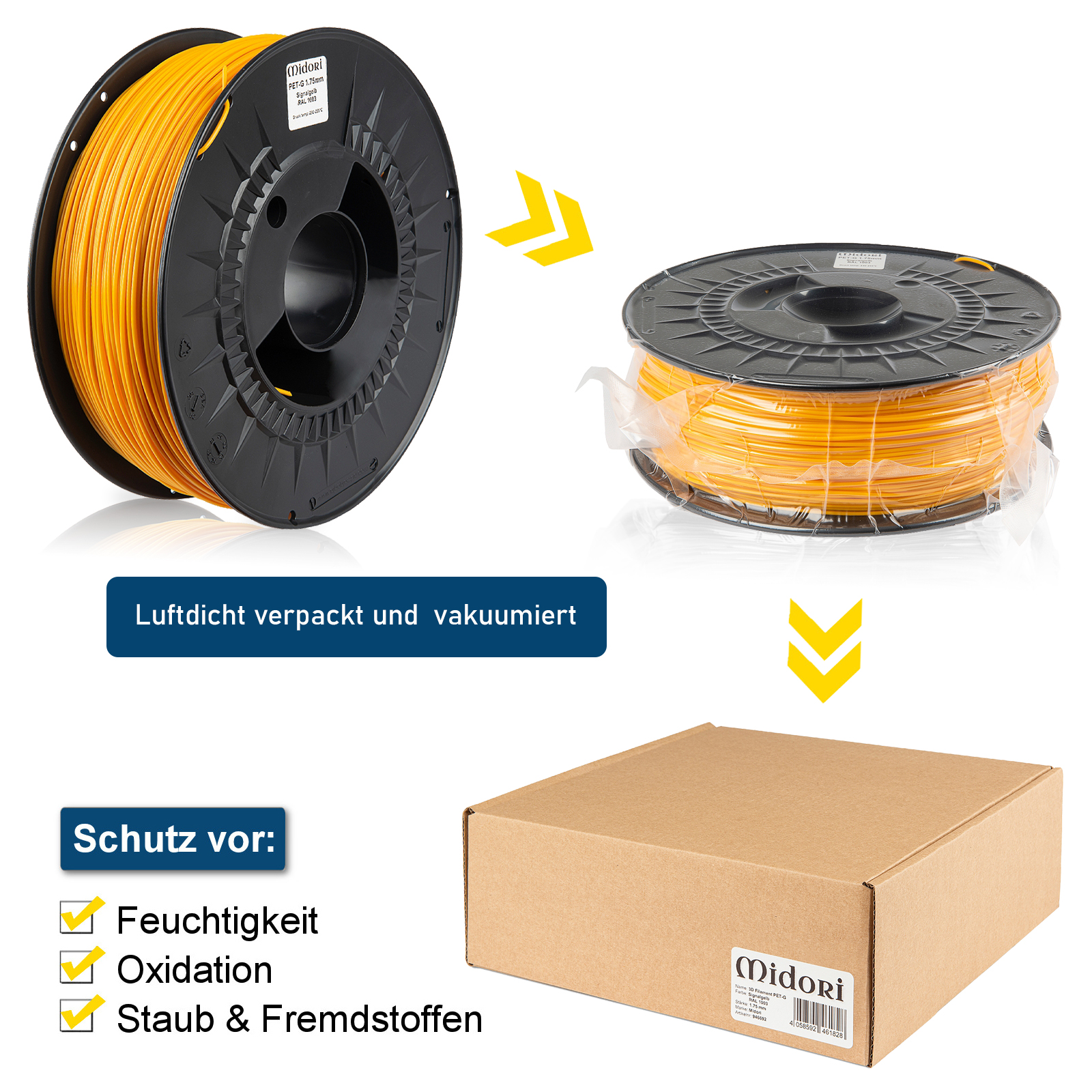 Die Midori PETG 3D-Filamente werden aus mit Glykol modifiziertem PET (Polyethylenterephthalat) gefertigt. Das in den Filamenten enthaltene Glykol hat niederviskose Eigenschaften, die den Druckprozess schneller und einfacher ablaufen lassen. Bei dem zugleich zähen, elastischen und extrem bruchfesten PETG Filamenten handelt es sich um einen insgesamt zuverlässigen Kunststoff, der im Vergleich zu PLA und ABS witterungsbeständig ist und sich somit auch für den Außenbereich eignet. Außerdem bringt PETG den Vorteil mit sich, dass diese im Unterschied zu anderen Kunststoffen völlig geruchsneutral ist.