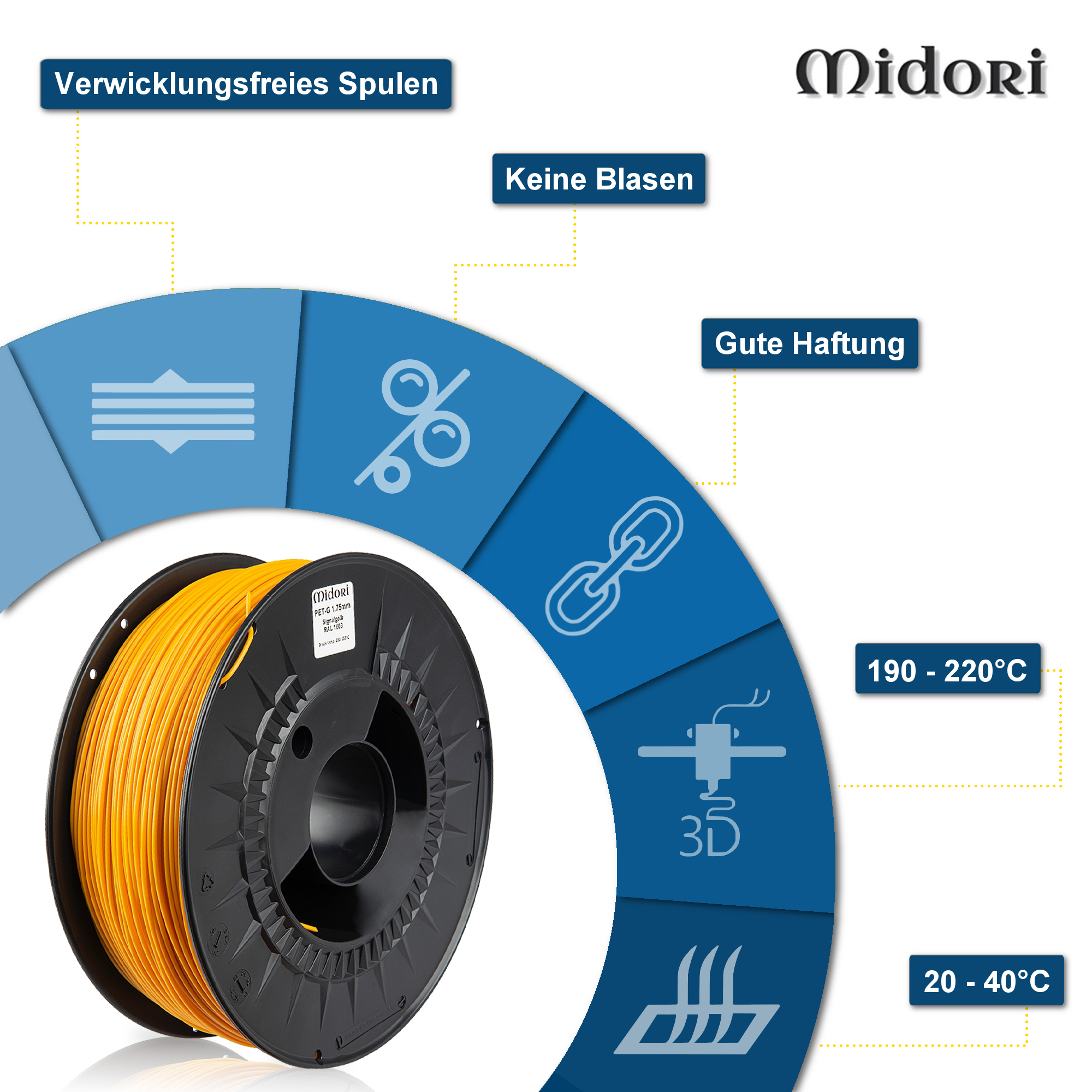 Unsere Midori PETG 3D-Filamente bestehen im Unterschied zu herkömmlichen PETG Konkurrenzprodukten aus reiner PETG (Polyethylenterephthalat mit Glykol). Die reine PETG hat gegenüber herkömmlichen Mixturen den Vorteil einer besseren Formgebung ohne Blasenbildung, Verstopfen oder Verziehen. Somit werden Ihnen glatte Ausdrucke mit hervorragender Schichthaftung und hoher Steifigkeit ermöglicht.