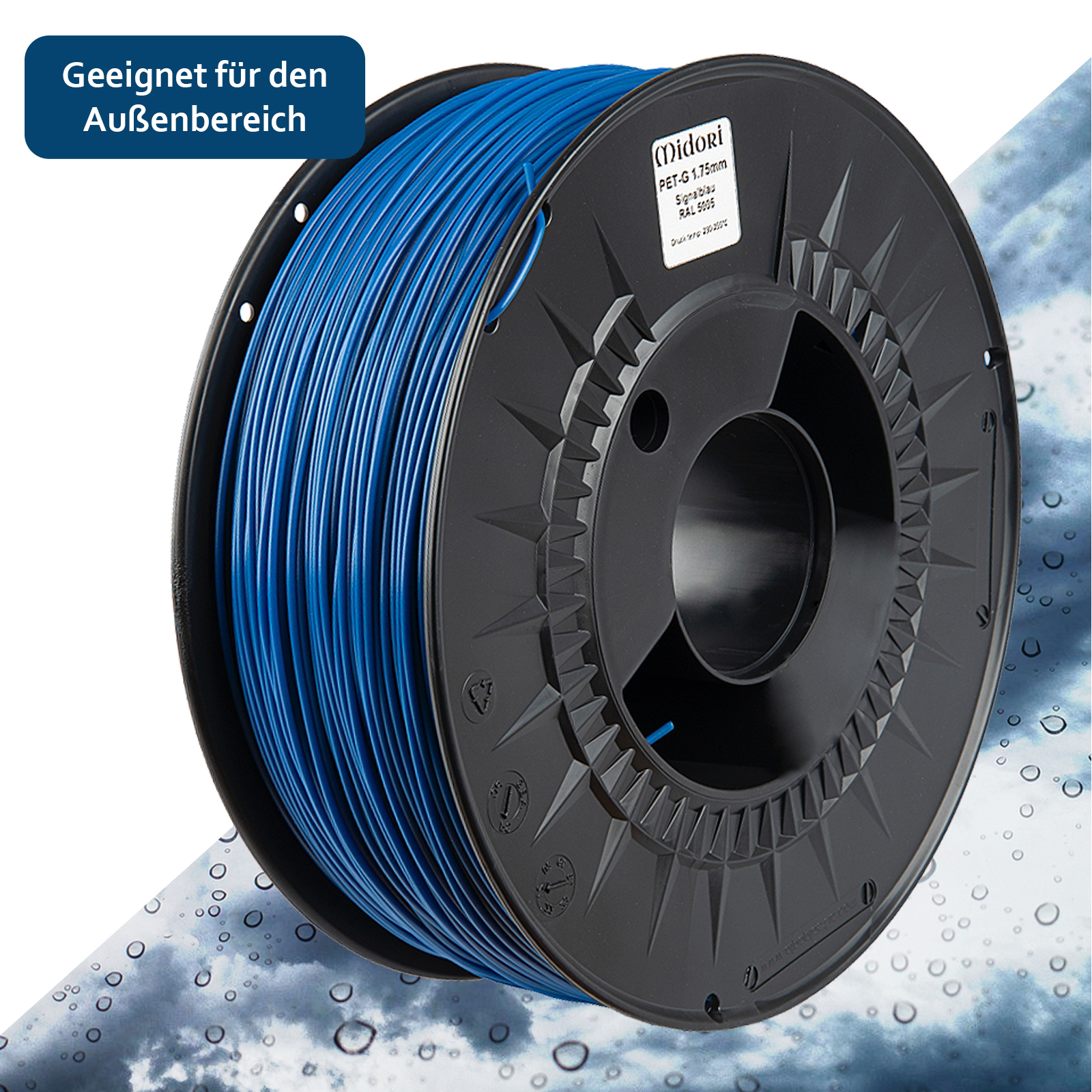 Die Midori PETG 3D-Filamente werden aus mit Glykol modifiziertem PET (Polyethylenterephthalat) gefertigt. Das in den Filamenten enthaltene Glykol hat niederviskose Eigenschaften, die den Druckprozess schneller und einfacher ablaufen lassen. Bei dem zugleich zähen, elastischen und extrem bruchfesten PETG Filamenten handelt es sich um einen insgesamt zuverlässigen Kunststoff, der im Vergleich zu PLA und ABS witterungsbeständig ist und sich somit auch für den Außenbereich eignet. Außerdem bringt PETG den Vorteil mit sich, dass diese im Unterschied zu anderen Kunststoffen völlig geruchsneutral ist.