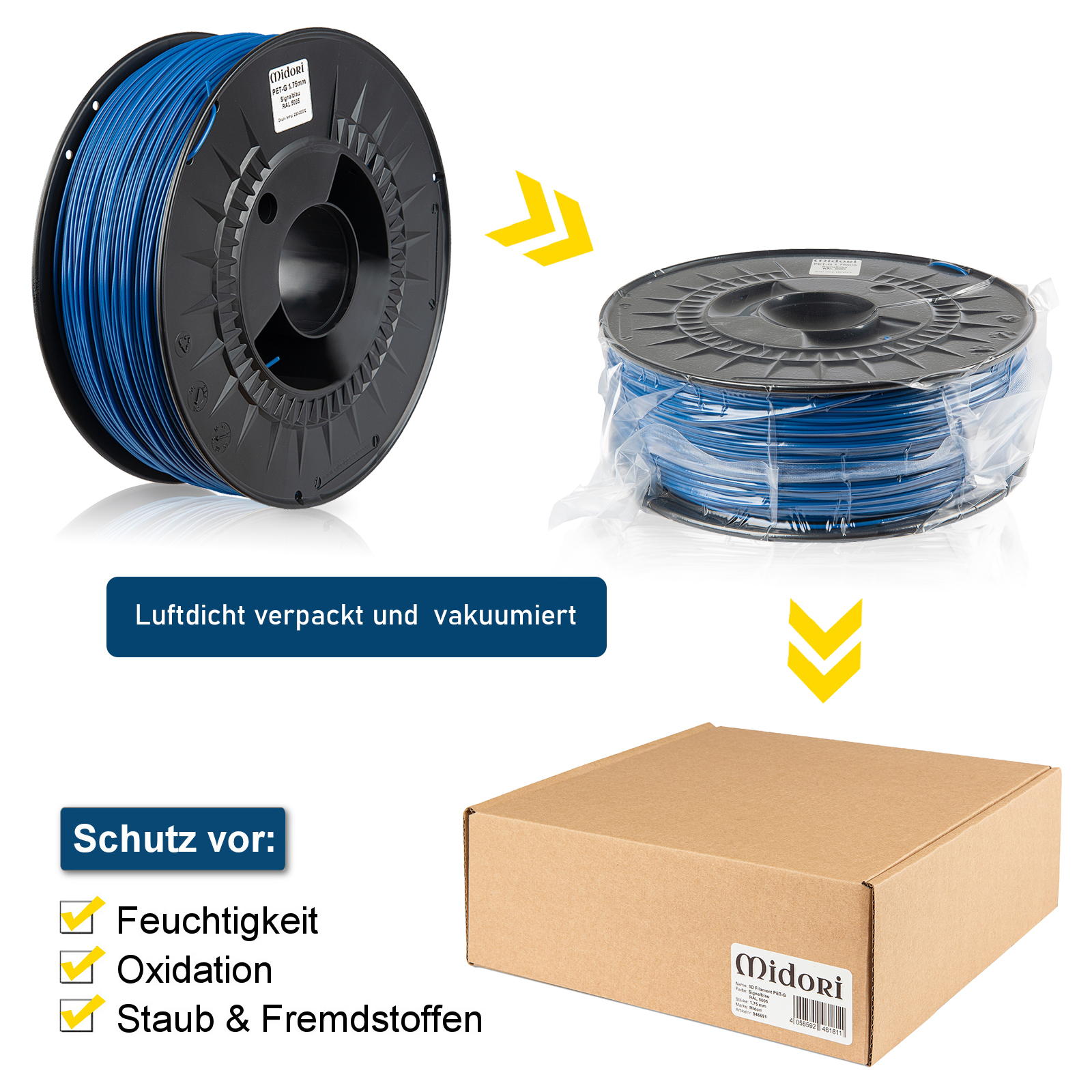 Unsere Midori 3D-Filamente sind auf extrem hochwertigen transparenten Spulen gewickelt, die anders als herkömmliche minderwertige Spulen für optimale Druckresultate auch beheizt werden können. Jede Spule ist mit Informationen über die Materialart, die Farbe (gegebenenfalls mit Angabe der RAL-Nummer), den Durchmesser und die Drucktemperatur versehen. Zum Schutz vor Staub und Fremdstoffen werden die Midori 3D-Filamente anders als herkömmliche Konkurrenzfilamente mit einem Feuchtigkeitsschutz-Beutel in einer wiederverschließbaren feuchtigkeits- und lichtundurchlässigen Aluminiumpackung vakuumversiegelt, womit optimale Lagerbedingungen geschaffen werden. Damit der optimale Zustand der Filamente bei ihrer Ankunft sichergestellt werden kann, werden die Spulen jeweils in eingeschweißten Umkartons verpackt.
