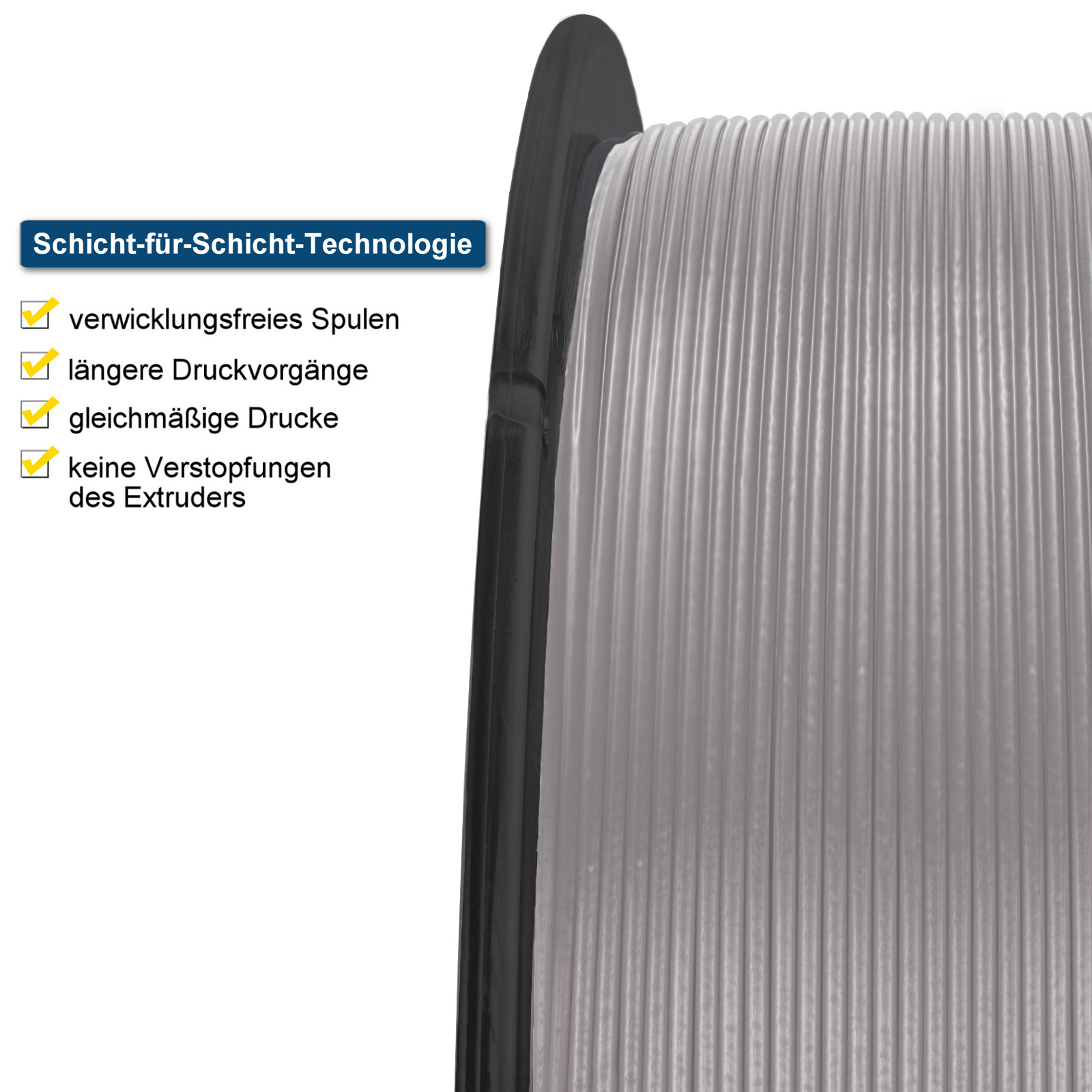 Mit unseren 1,75 mm PETG 3D-Filamenten setzen wir auf höchste Präzision im gesamten Produktionsprozess. Die Herstellung der Filamente erfolgt unter strengsten Prüfungsmechanismen, sodass der Durchmesser der hochwertigen Filamente in jedem Zentimeter eine Toleranz von nur +/- 0,05 mm aufweist. Der daraus entstehende nahezu konstante Filament-Durchmesser verhindert Verstauungen und sorgt für ein reibungsloses Drucken ohne Unterbrechungen, woraus beim Drucken eine minimale Schrumpfung, stärkere Schichthaftung, sowie eine glattere Oberfläche resultieren.