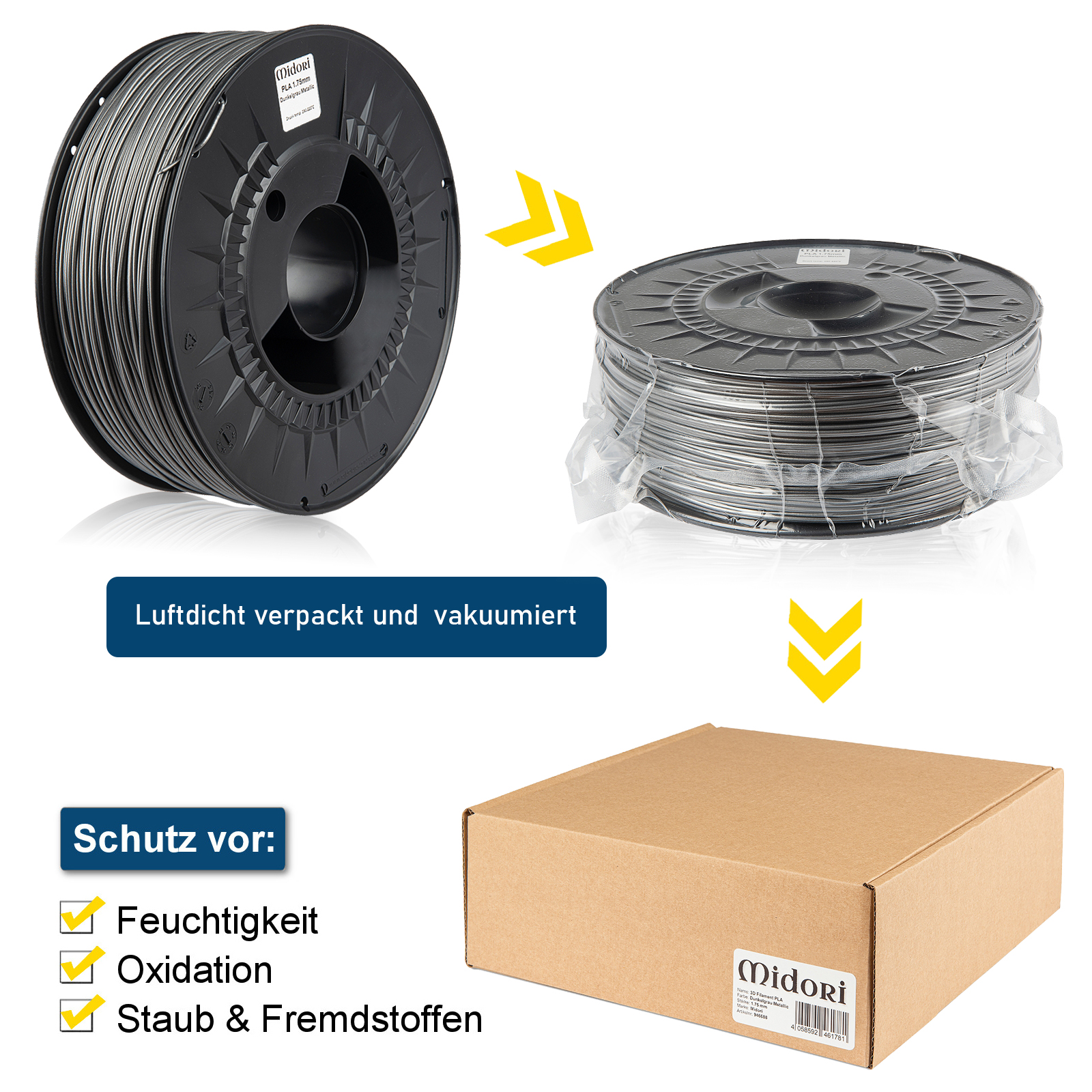 Unsere Midori 3D-Filamente sind auf extrem hochwertigen transparenten Spulen gewickelt, die anders als herkömmliche minderwertige Spulen für optimale Druckresultate auch beheizt werden können. Jede Spule ist mit Informationen über die Materialart, die Farbe (gegebenenfalls mit Angabe der RAL-Nummer), den Durchmesser und die Drucktemperatur versehen. Zum Schutz vor Staub und Fremdstoffen werden die Midori 3D-Filamente anders als herkömmliche Konkurrenzfilamente mit einem Feuchtigkeitsschutz-Beutel in einer wiederverschließbaren feuchtigkeits- und lichtundurchlässigen Aluminiumpackung vakuumversiegelt, womit optimale Lagerbedingungen geschaffen werden. Damit der optimale Zustand der Filamente bei ihrer Ankunft sichergestellt werden kann, werden die Spulen jeweils in eingeschweißten Umkartons verpackt.