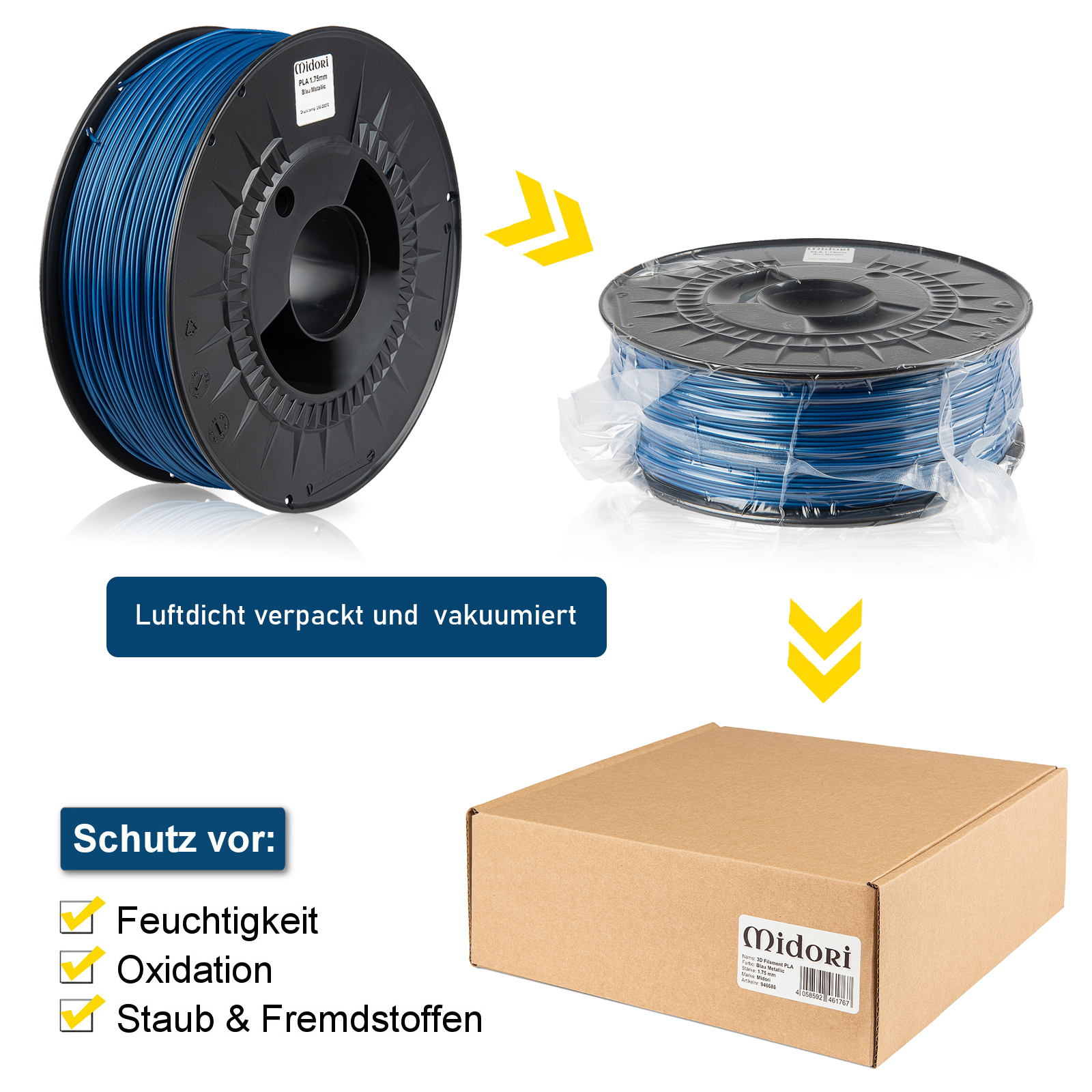Unsere Midori 3D-Filamente sind auf extrem hochwertigen transparenten Spulen gewickelt, die anders als herkömmliche minderwertige Spulen für optimale Druckresultate auch beheizt werden können. Jede Spule ist mit Informationen über die Materialart, die Farbe (gegebenenfalls mit Angabe der RAL-Nummer), den Durchmesser und die Drucktemperatur versehen. Zum Schutz vor Staub und Fremdstoffen werden die Midori 3D-Filamente anders als herkömmliche Konkurrenzfilamente mit einem Feuchtigkeitsschutz-Beutel in einer wiederverschließbaren feuchtigkeits- und lichtundurchlässigen Aluminiumpackung vakuumversiegelt, womit optimale Lagerbedingungen geschaffen werden. Damit der optimale Zustand der Filamente bei ihrer Ankunft sichergestellt werden kann, werden die Spulen jeweils in eingeschweißten Umkartons verpackt.