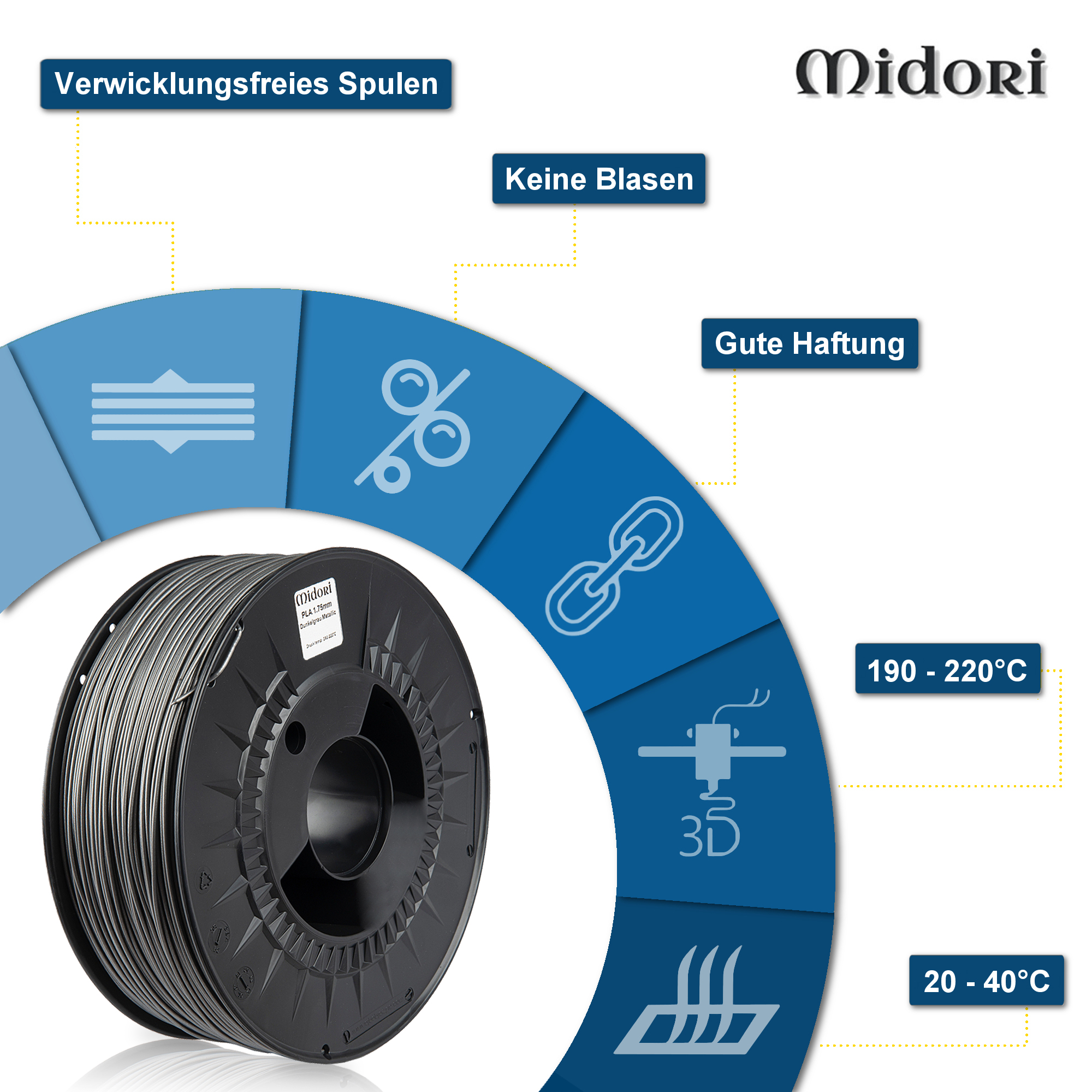 Unsere Midori PLA 3D-Filamente bestehen im Unterschied zu herkömmlichen PLA Konkurrenzprodukten aus reiner PLA (Polylactic Acid/Polymilchsäure). Die reine PLA hat gegenüber herkömmlichen Mixturen den Vorteil einer besseren Formgebung ohne Blasenbildung, Verstopfen oder Verziehen. Somit werden Ihnen glatte Ausdrucke mit hervorragender Schichthaftung und hoher Steifigkeit ermöglicht.
