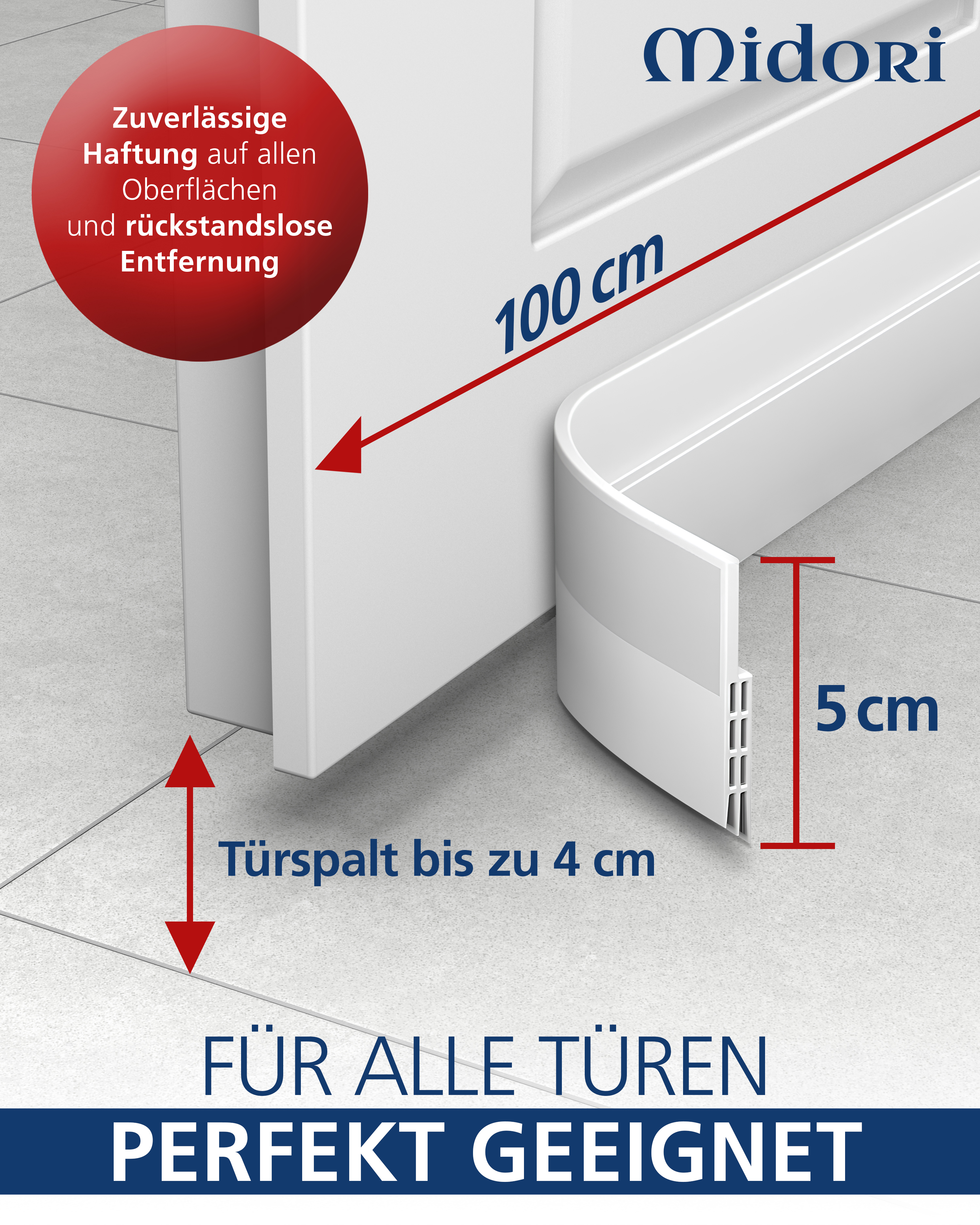 Unsere Türdichtungen von Midori bieten nicht nur Schutz vor Zugluft und verbessern die Energieeffizienz, sondern sind auch vielseitig einsetzbar. Sie eignen sich für alle glatten Oberflächen und können einfach auf die Breite jeder Tür zugeschnitten werden. Diese Flexibilität gewährleistet eine perfekte Passform und macht sie zur idealen Lösung für jedes Zuhause. Ob für Haustüren, Innentüren oder Schiebetüren – mit unseren Türdichtungen erhalten Sie zuverlässigen Schutz und eine einfache Anpassung für maximale Effektivität.