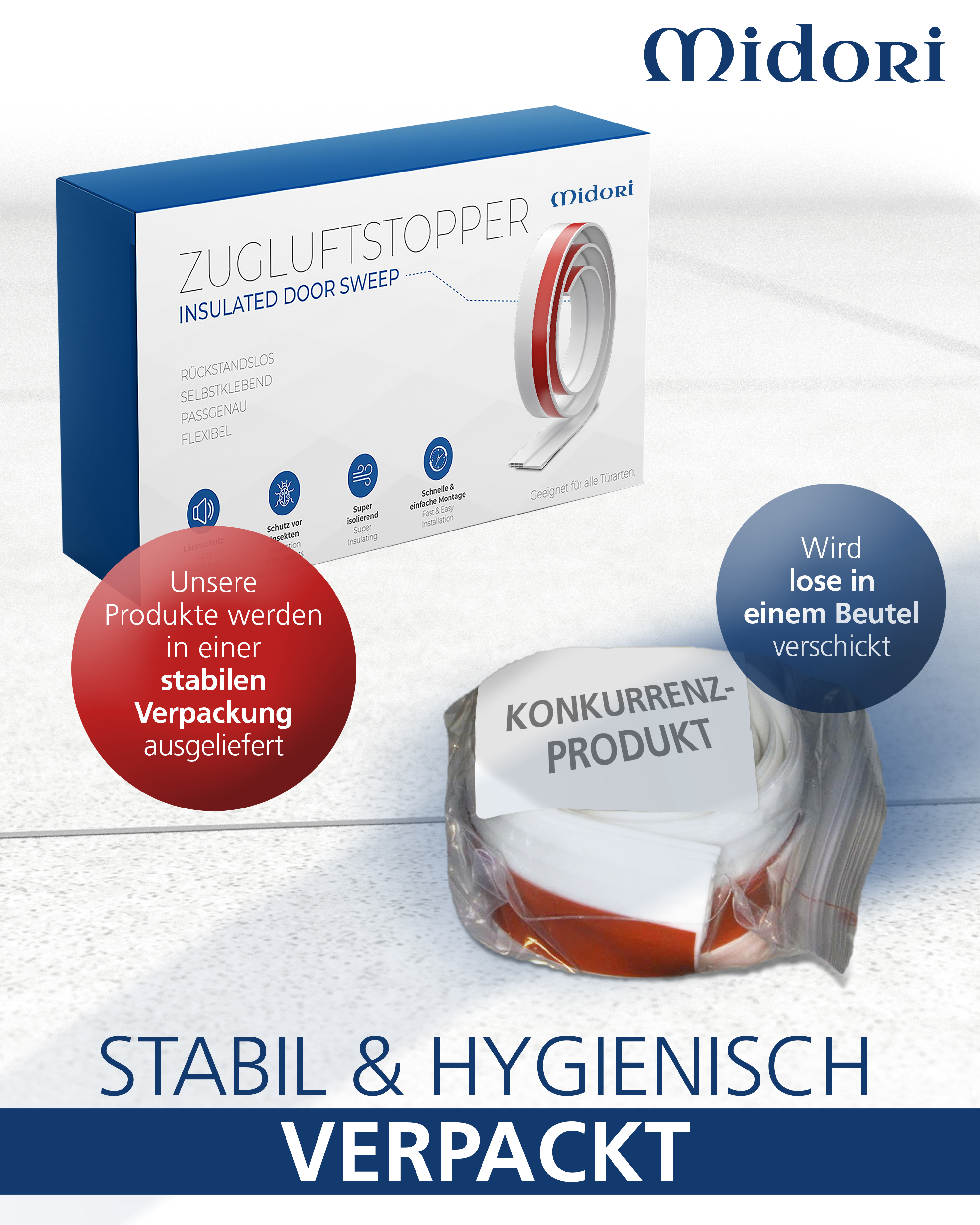 Unsere Türdichtungen von Midori bieten nicht nur Schutz vor Zugluft und verbessern die Energieeffizienz, sondern sind auch vielseitig einsetzbar. Sie eignen sich für alle glatten Oberflächen und können einfach auf die Breite jeder Tür zugeschnitten werden. Diese Flexibilität gewährleistet eine perfekte Passform und macht sie zur idealen Lösung für jedes Zuhause. Ob für Haustüren, Innentüren oder Schiebetüren – mit unseren Türdichtungen erhalten Sie zuverlässigen Schutz und eine einfache Anpassung für maximale Effektivität.