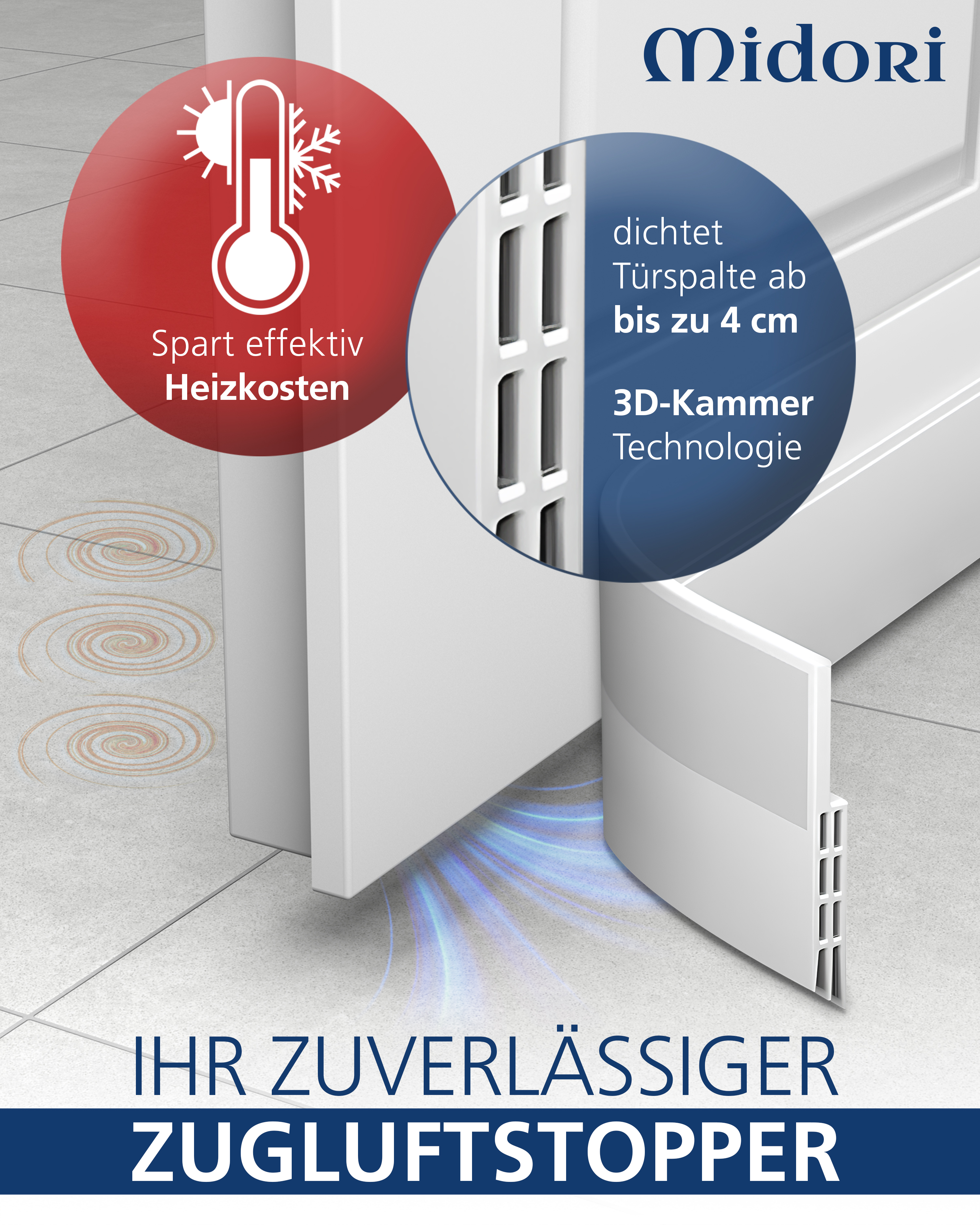 Unsere Türdichtungen von Midori bieten umfassenden Schutz vor Zugluft und sind als effiziente Luftzugstopper konzipiert. Diese Dichtungen tragen zur Energieeinsparung bei, indem sie als Kältestopper wirken und Wärmebrücken beseitigen. Dank der innovativen 3D-Kammertechnologie verhindern sie das Entweichen von kalter und warmer Luft, unterstützen die Aufrechterhaltung der idealen Raumtemperatur und reduzieren den Energieverbrauch, was langfristig zu Einsparungen führt.