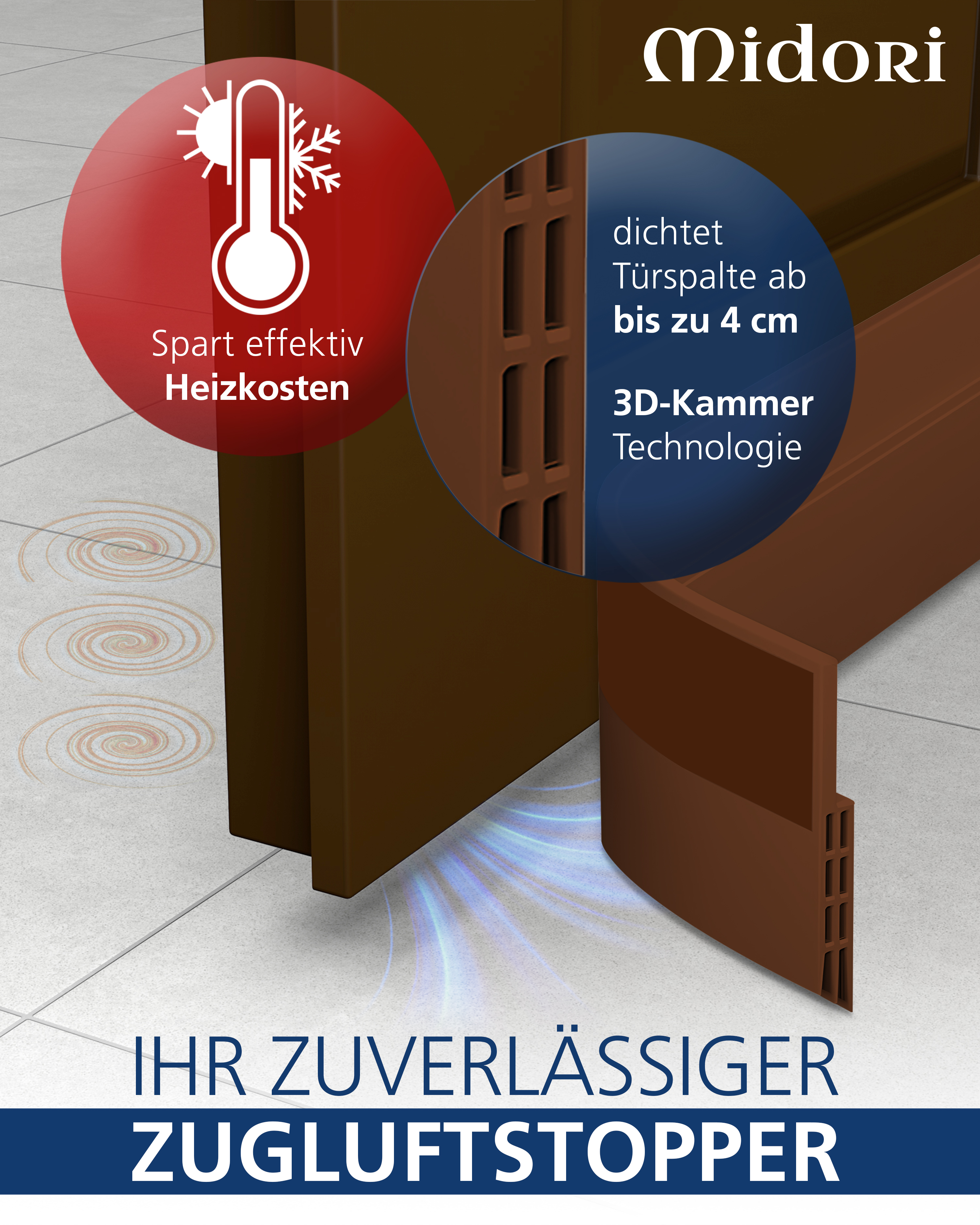 Unsere Türdichtungen von Midori bieten umfassenden Schutz vor Zugluft und sind als effiziente Luftzugstopper konzipiert. Diese Dichtungen tragen zur Energieeinsparung bei, indem sie als Kältestopper wirken und Wärmebrücken beseitigen. Dank der innovativen 3D-Kammertechnologie verhindern sie das Entweichen von kalter und warmer Luft, unterstützen die Aufrechterhaltung der idealen Raumtemperatur und reduzieren den Energieverbrauch, was langfristig zu Einsparungen führt.