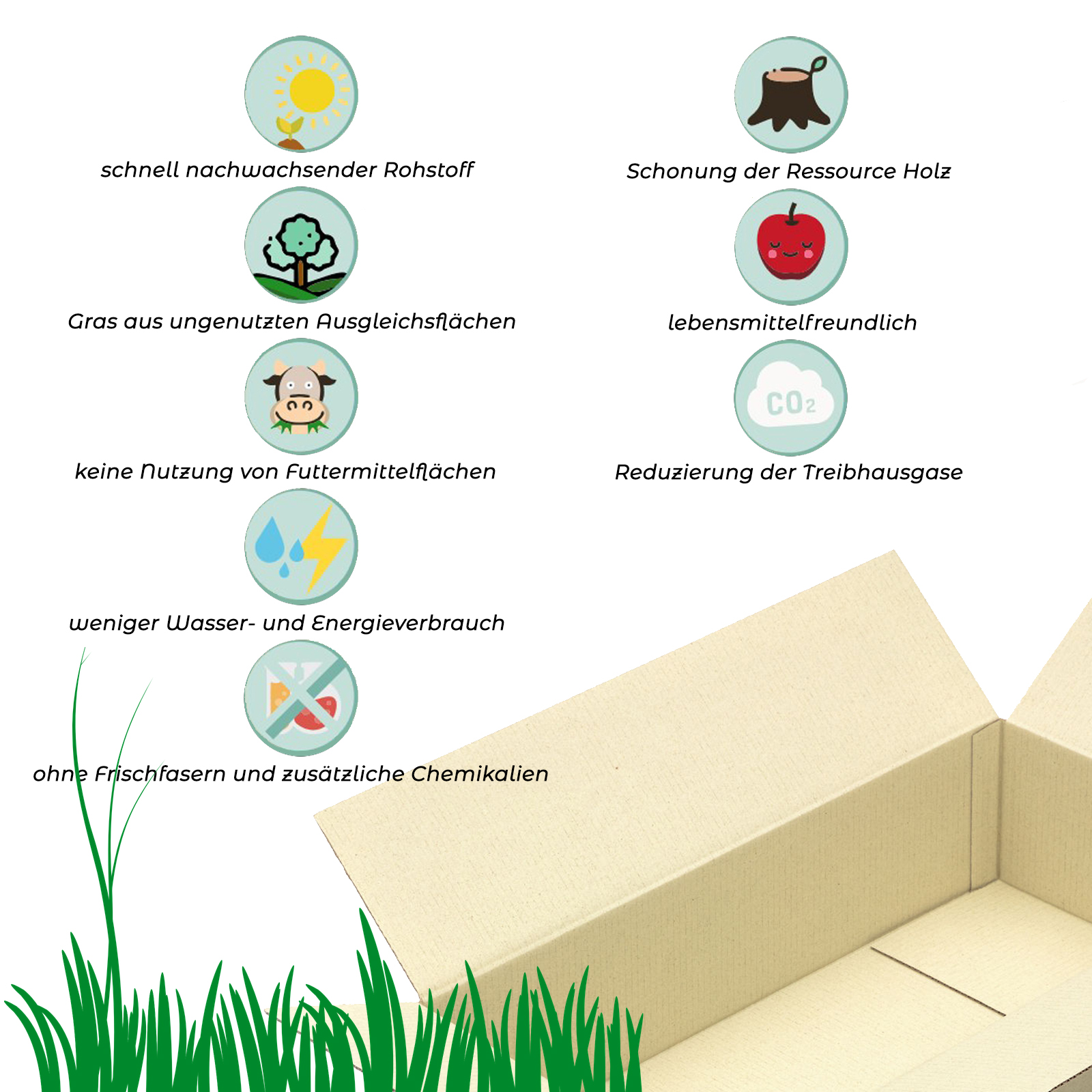 Unsere KK Verpackungen Graskartons sind eine umweltfreundliche und ressourcenschonenden Alternative zu herkömmlichen Wellpappkartons aus Papier aus Holzfasern, da das innovative Material aus Grasschnitt von landwirtschaftlichen Ausgleichsflächen und aus Recylingpapier hergestellt werden und somit problemlos über das Altpapier entsorgt werden können und dabei ohne neuen Holzeinschlag auskommen.